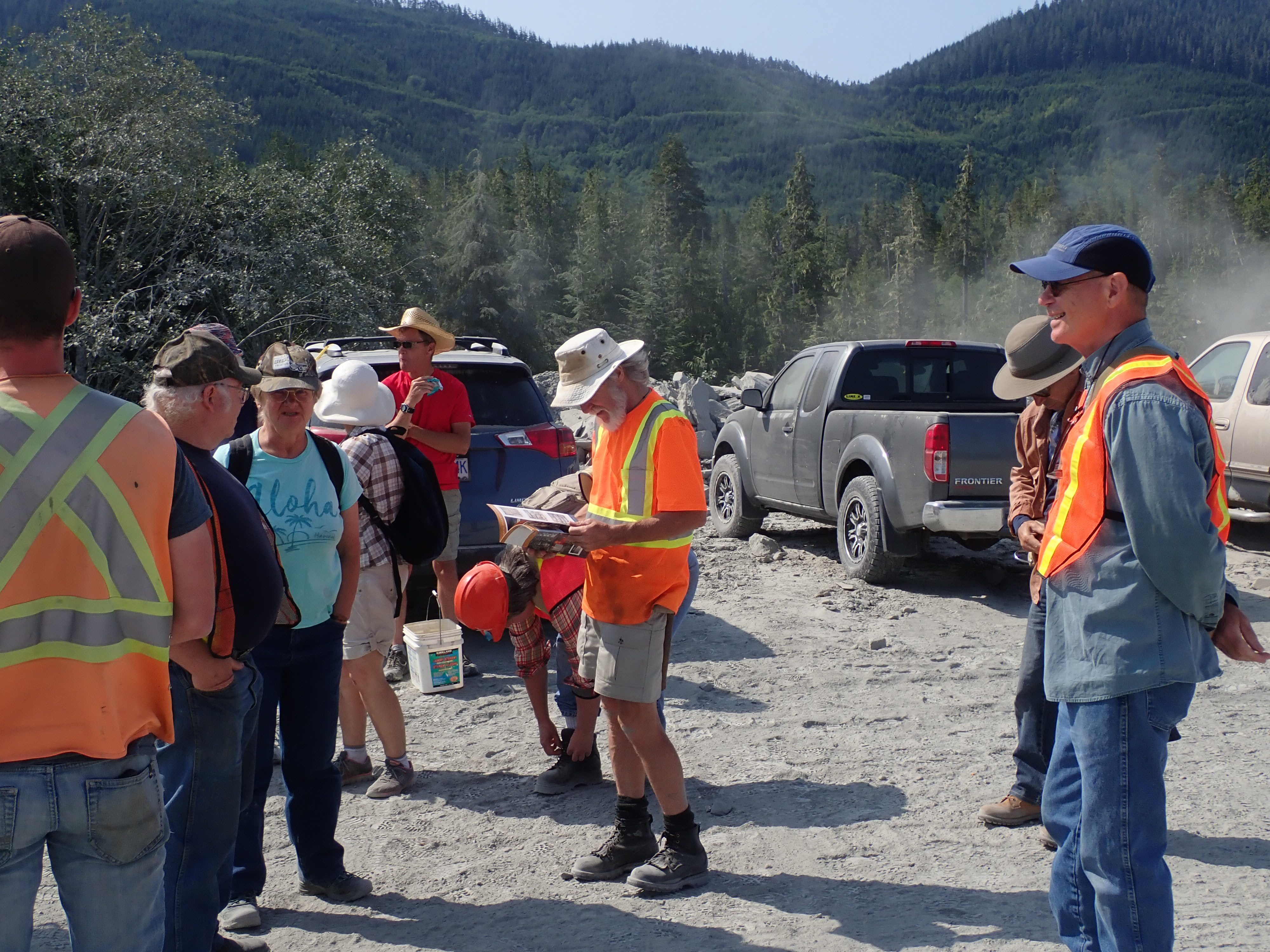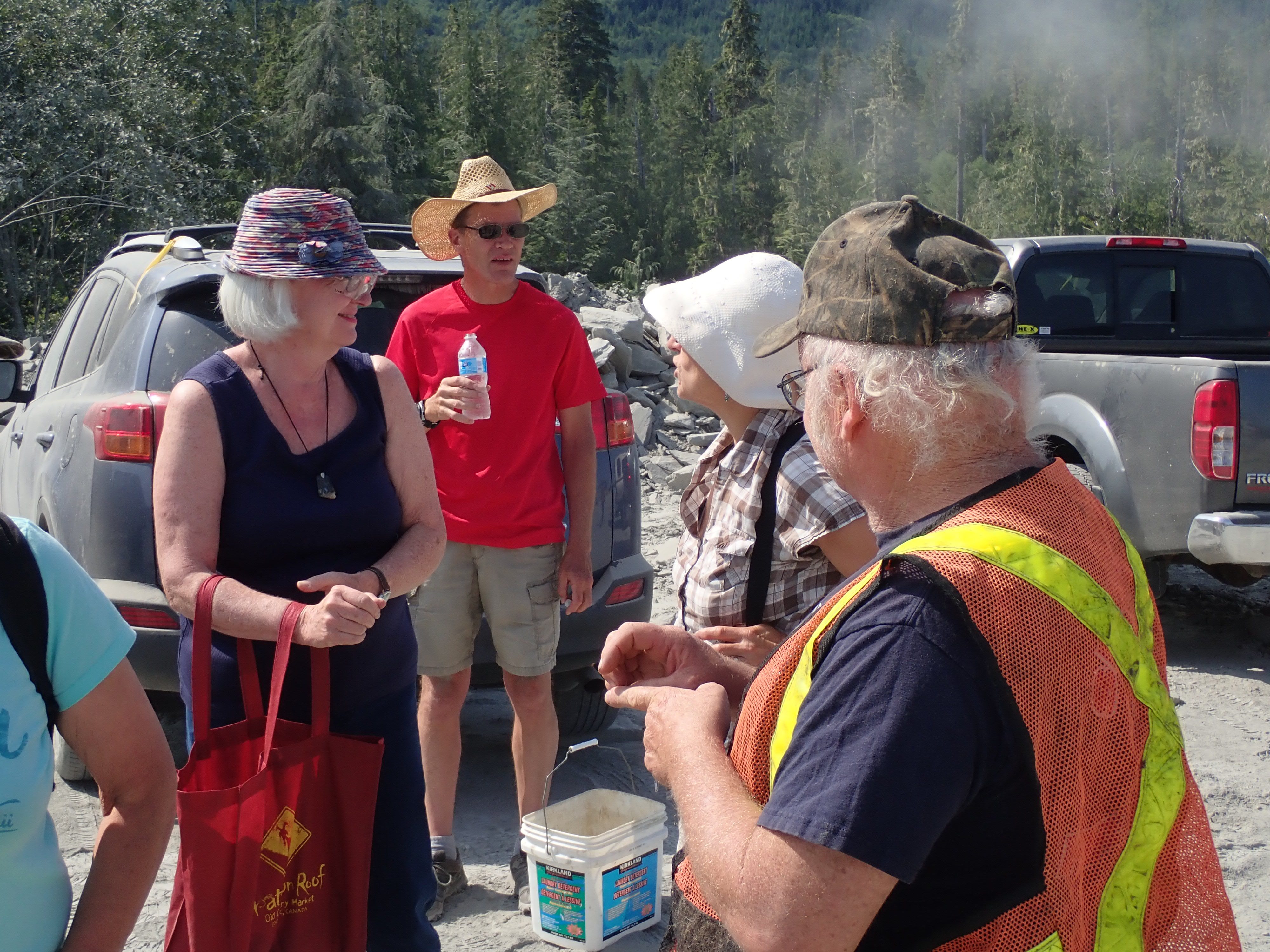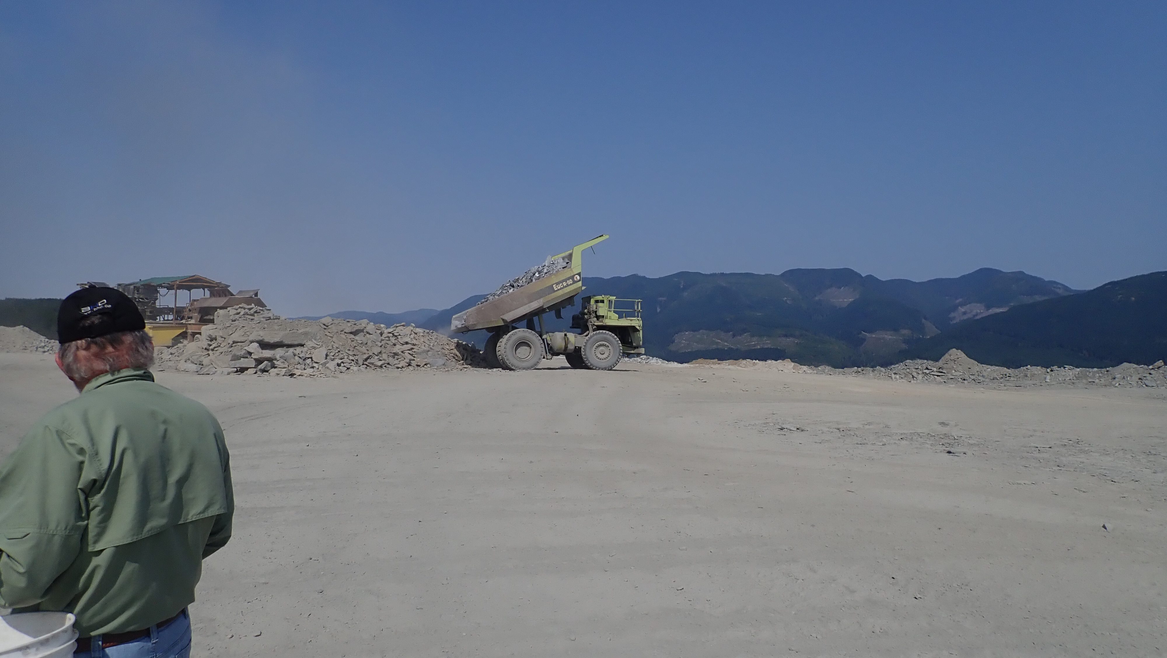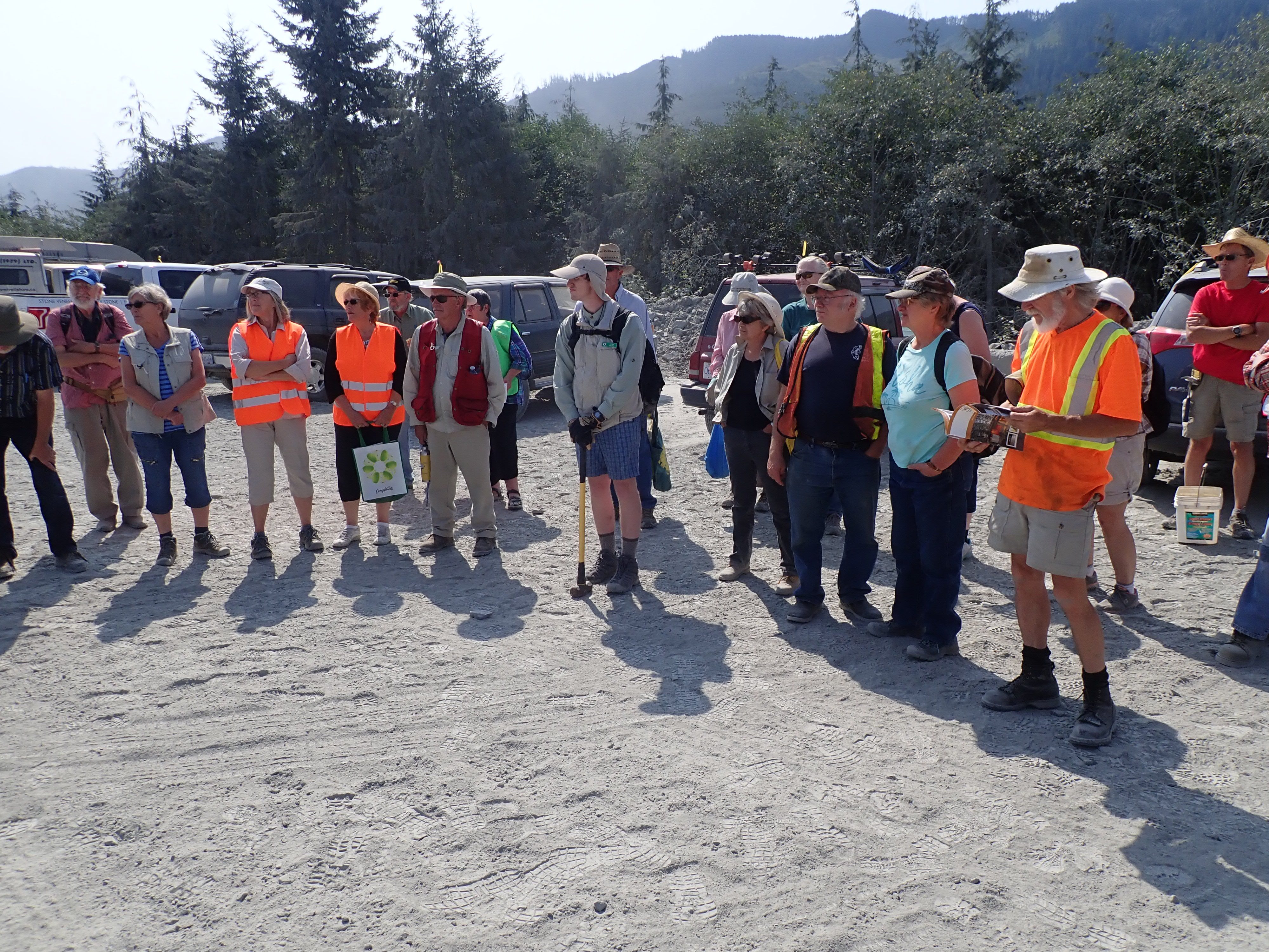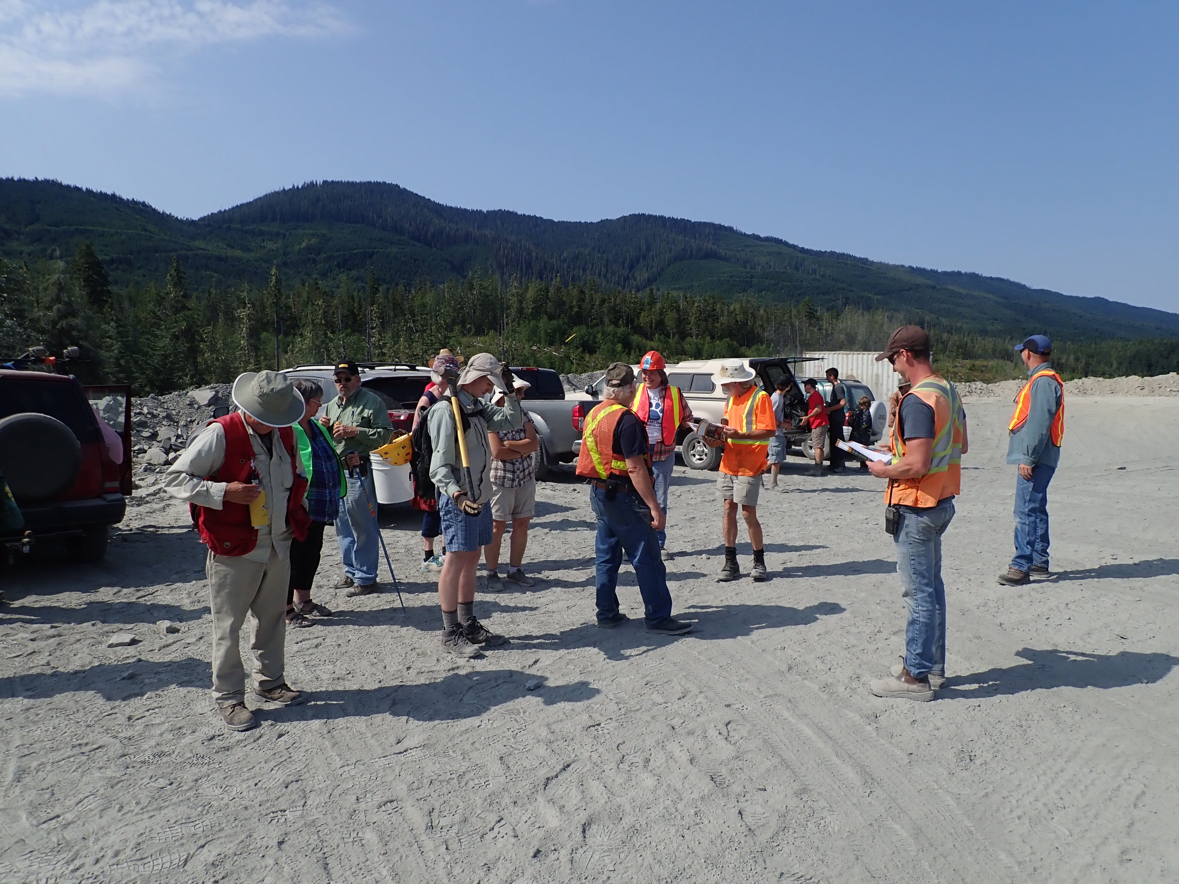 The K2 Quarry is located past Lizard lake on a challenging and extremely dusty logging road.  A convoy of around 12 high-clearance vehicles made the trip, loaded to the gunnels with all who wanted to attend.  We were met for the last segment by Matt Girard from the Nanaimo office of K2 Stone.  In the quarry we had an hour walk-and-talk on how K2 operates. We were allowed to take any sample of rock we could physically carry to our vehicles – which led to some team efforts.