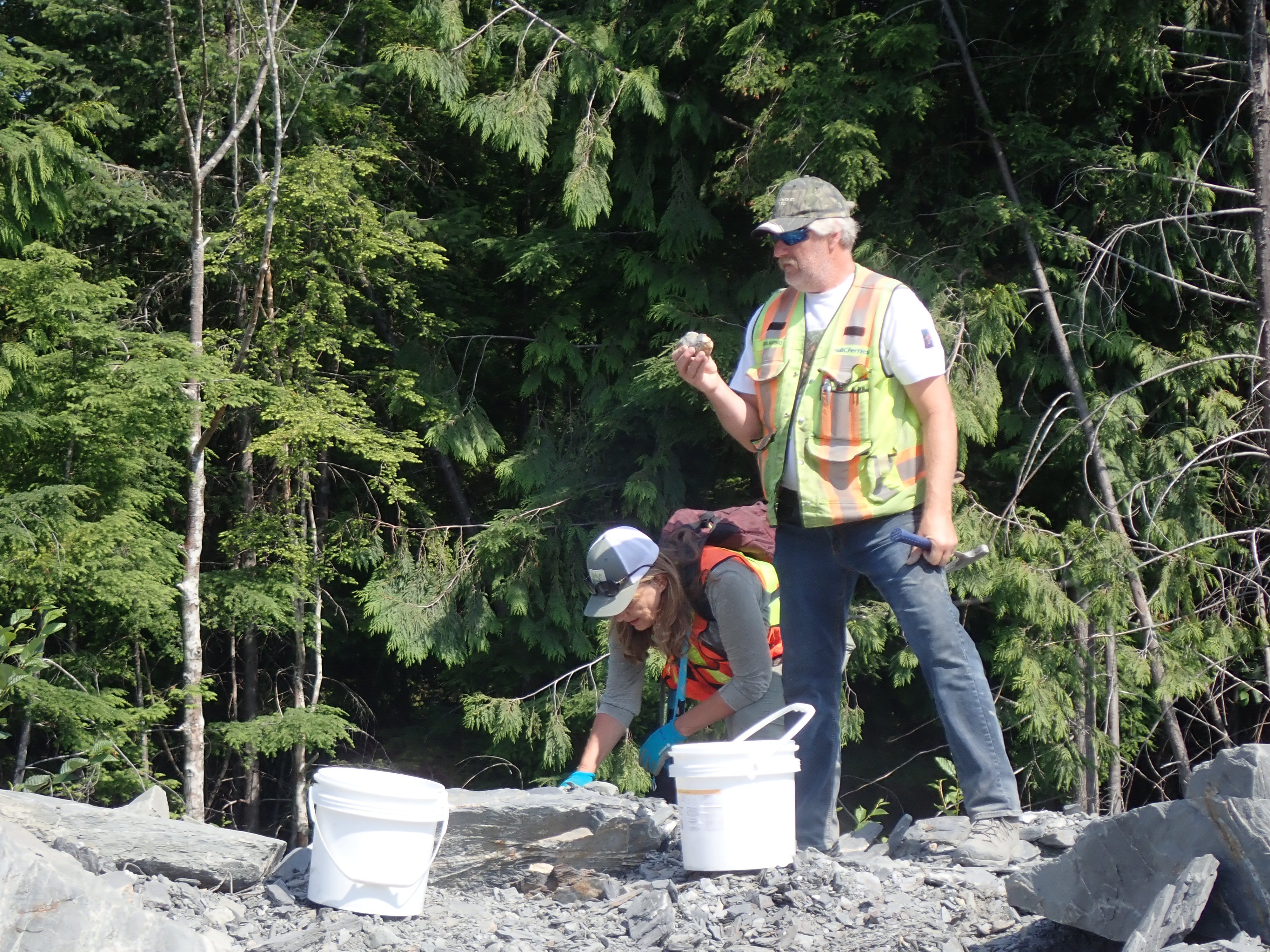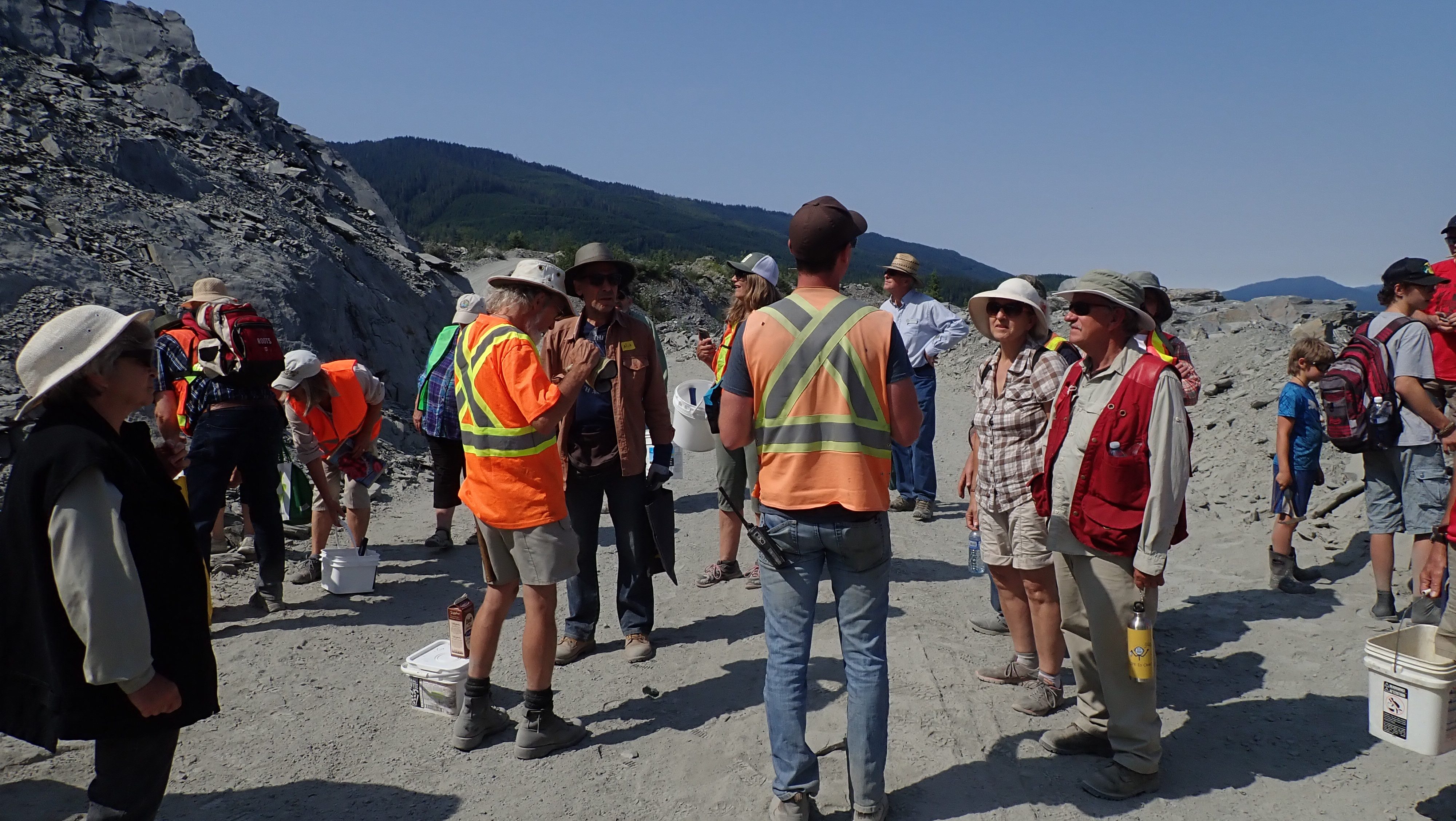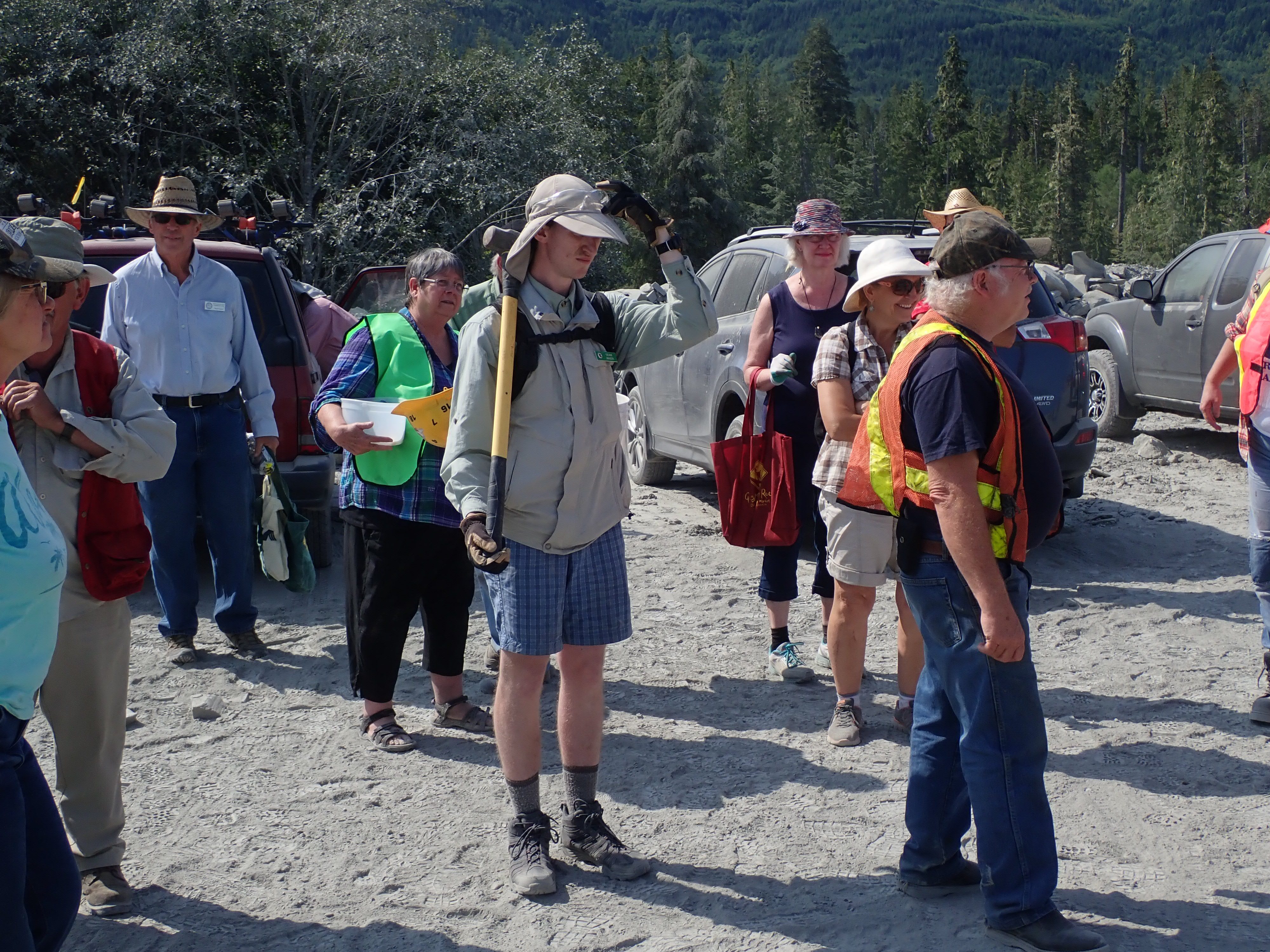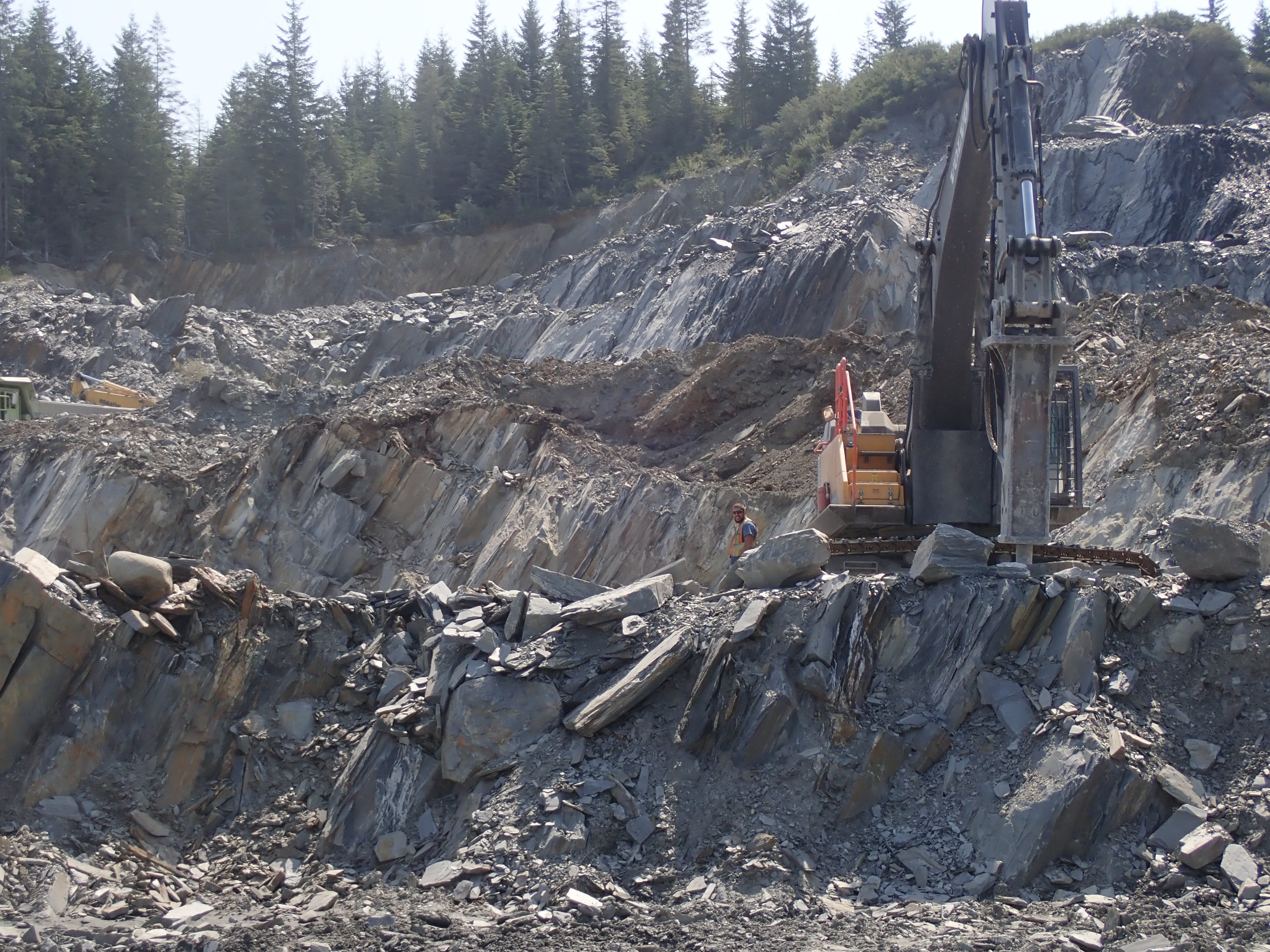 The K2 Quarry is located past Lizard lake on a challenging and extremely dusty logging road.  A convoy of around 12 high-clearance vehicles made the trip, loaded to the gunnels with all who wanted to attend.  We were met for the last segment by Matt Girard from the Nanaimo office of K2 Stone.  In the quarry we had an hour walk-and-talk on how K2 operates. We were allowed to take any sample of rock we could physically carry to our vehicles – which led to some team efforts.