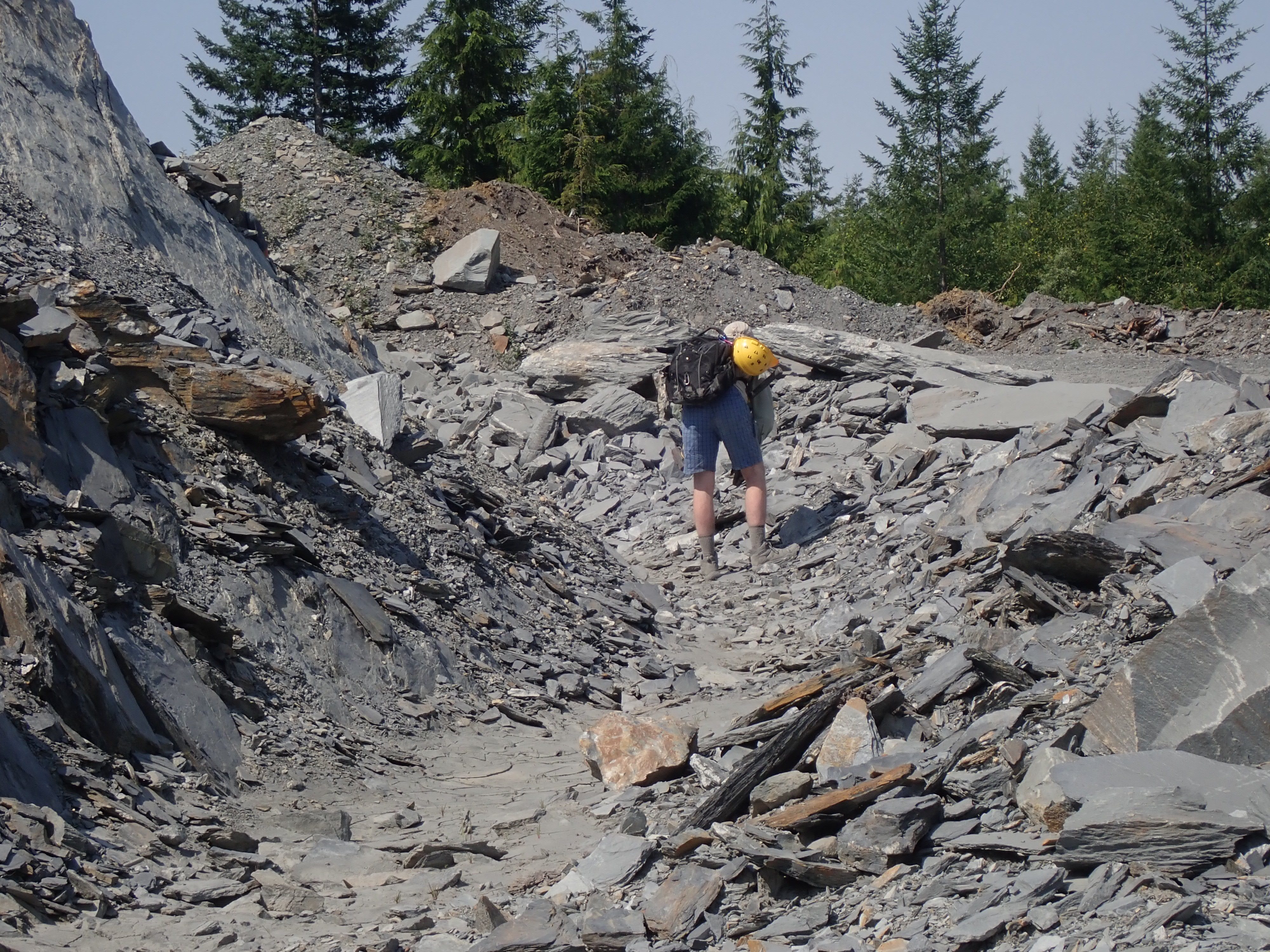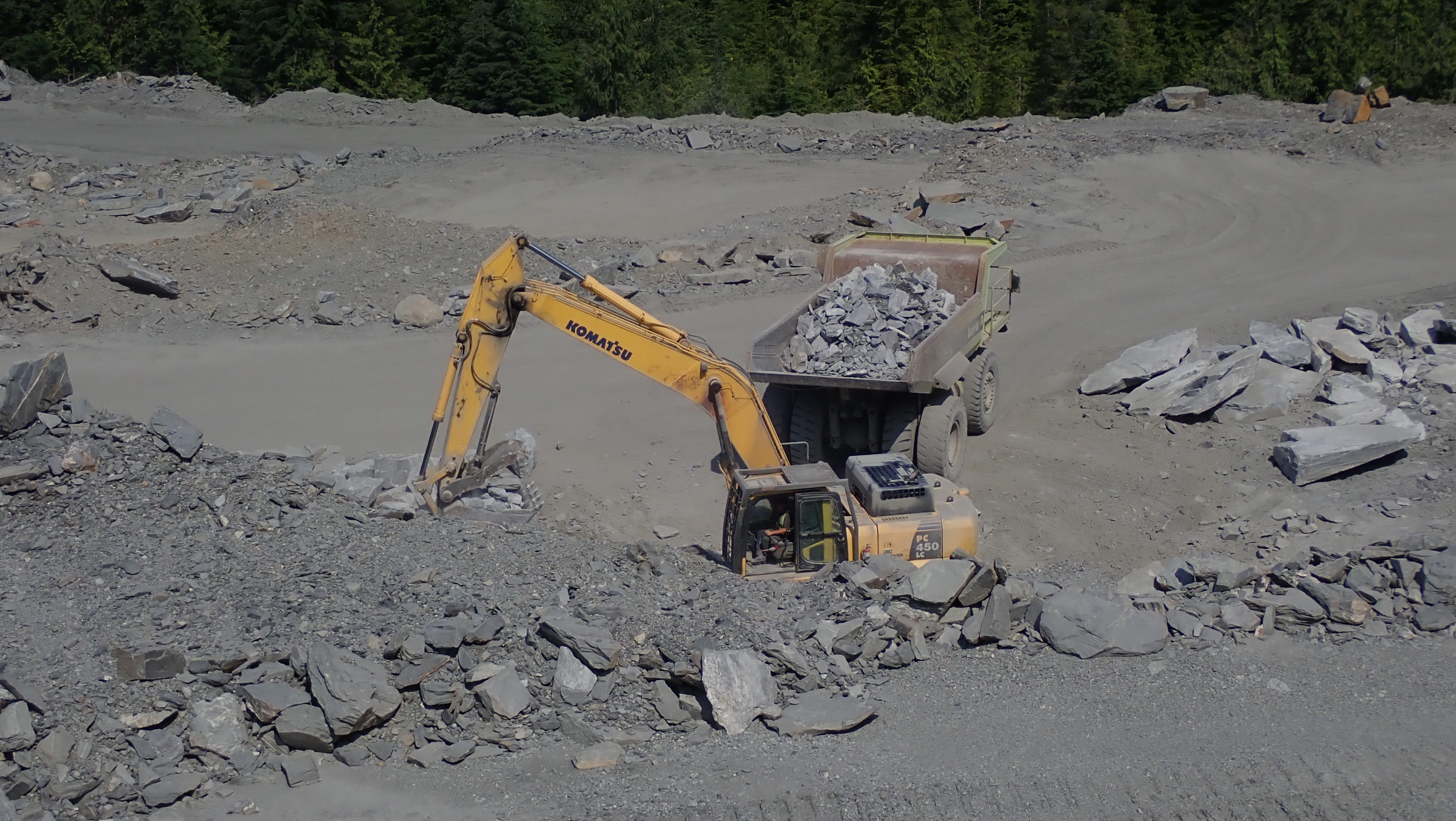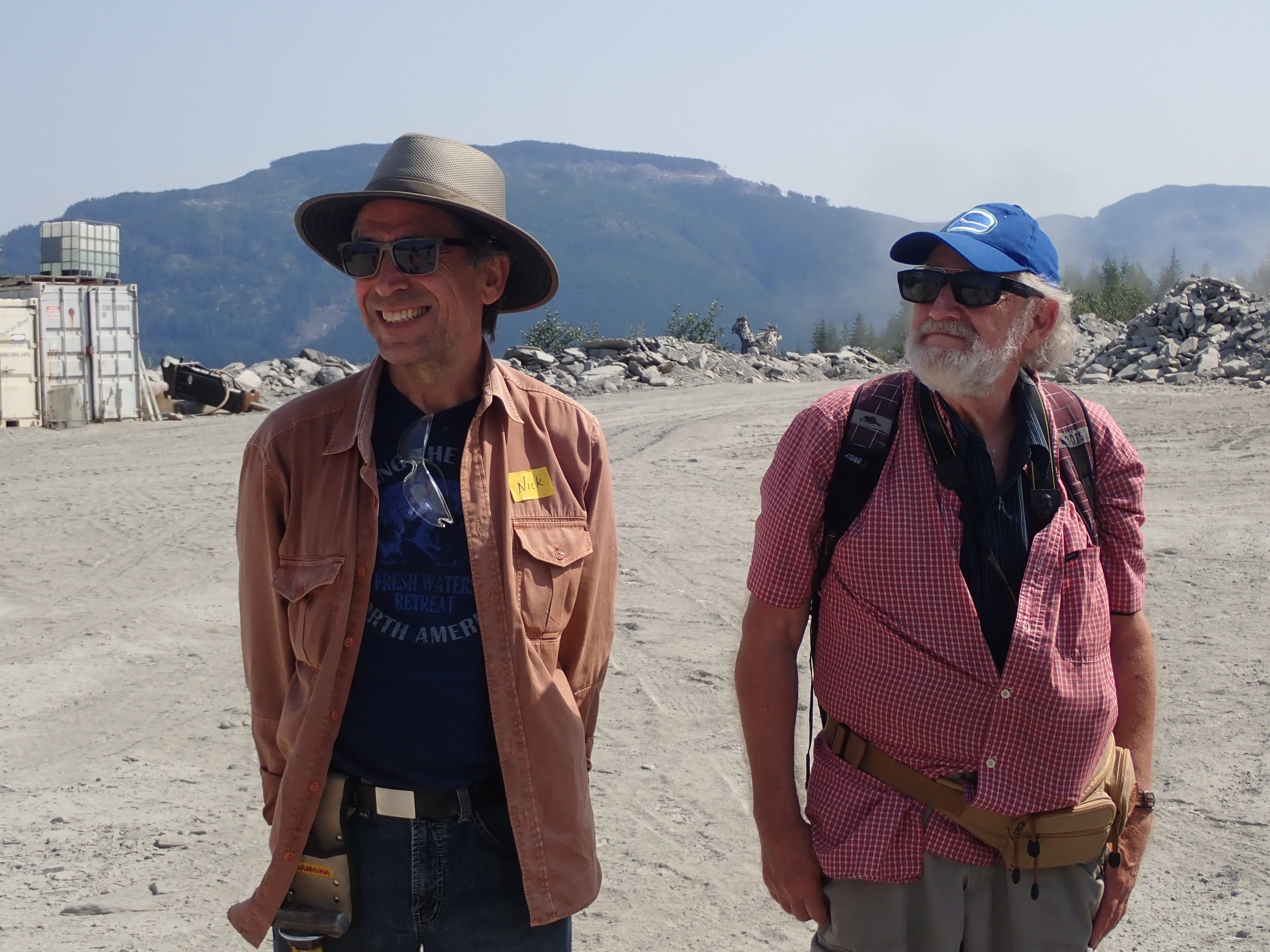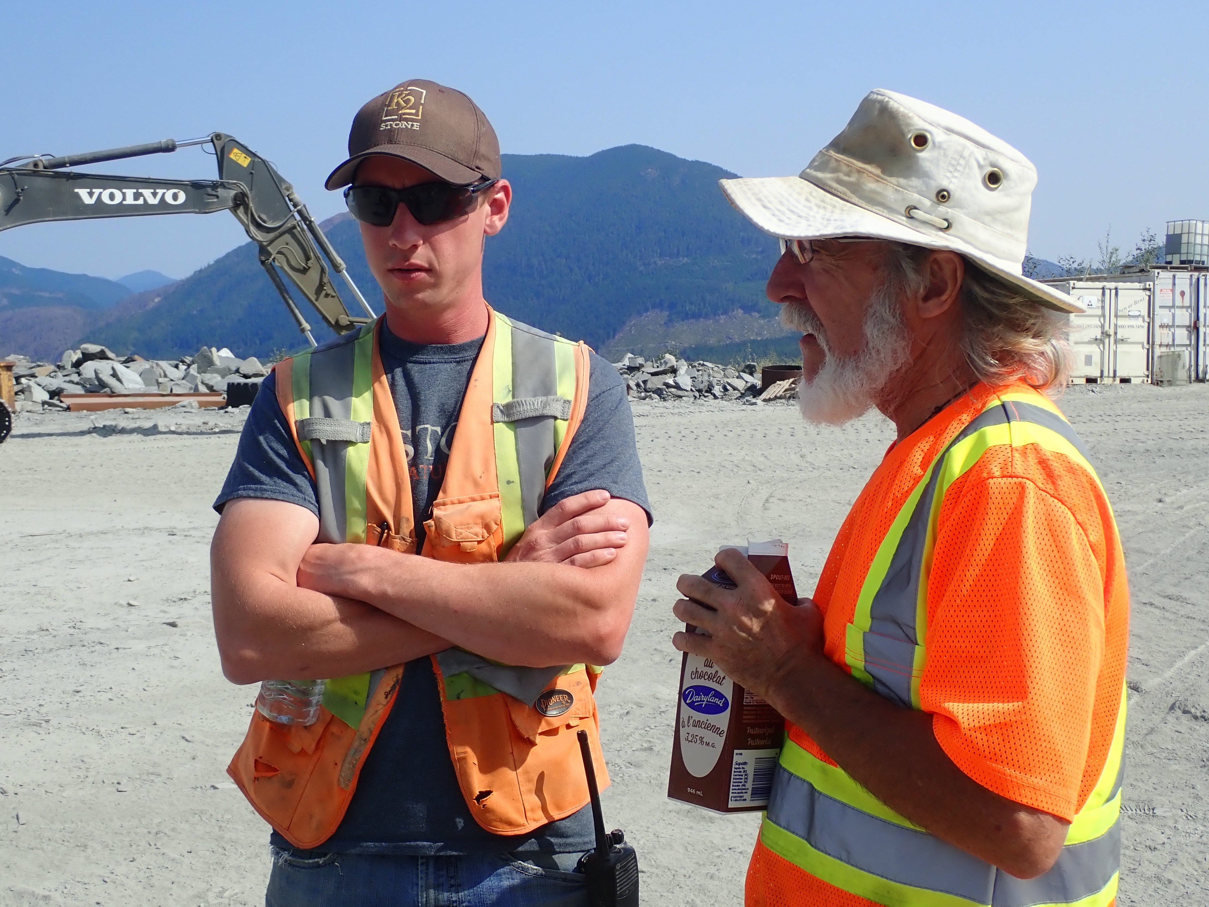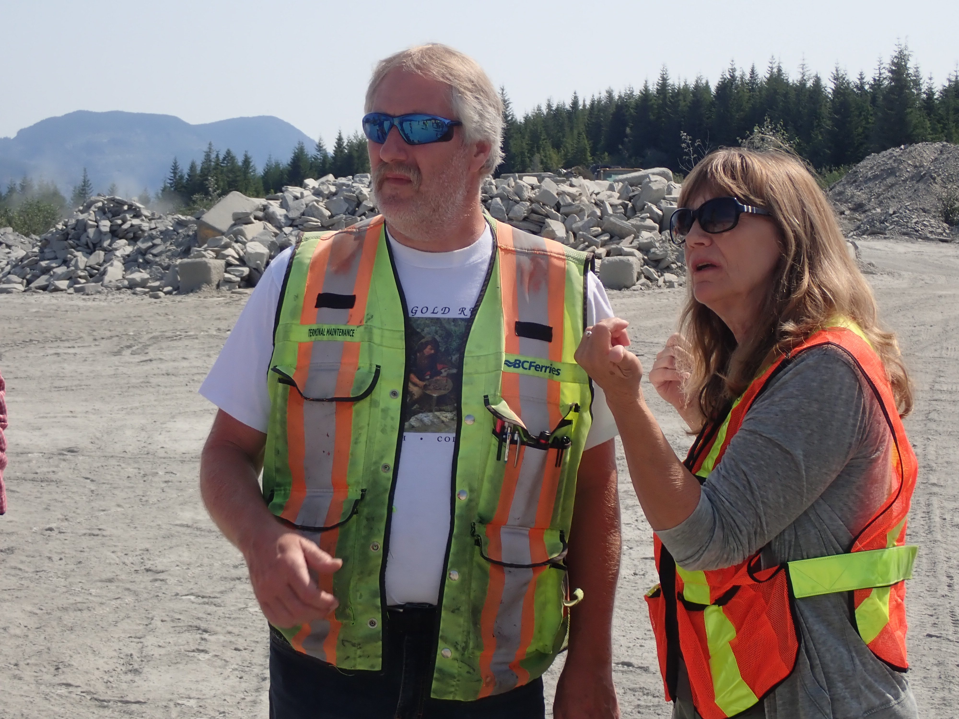 The K2 Quarry is located past Lizard lake on a challenging and extremely dusty logging road.  A convoy of around 12 high-clearance vehicles made the trip, loaded to the gunnels with all who wanted to attend.  We were met for the last segment by Matt Girard from the Nanaimo office of K2 Stone.  In the quarry we had an hour walk-and-talk on how K2 operates. We were allowed to take any sample of rock we could physically carry to our vehicles – which led to some team efforts.