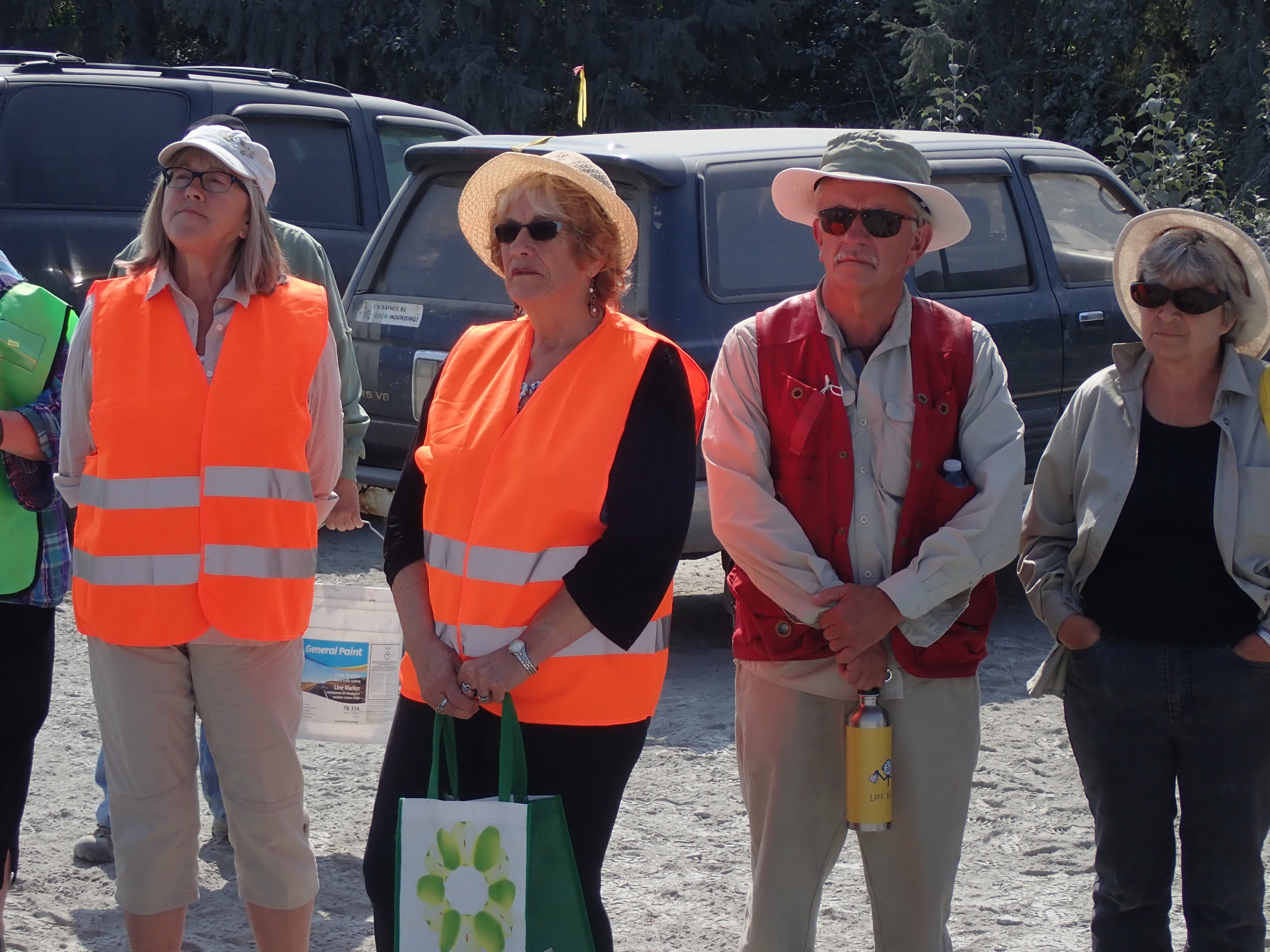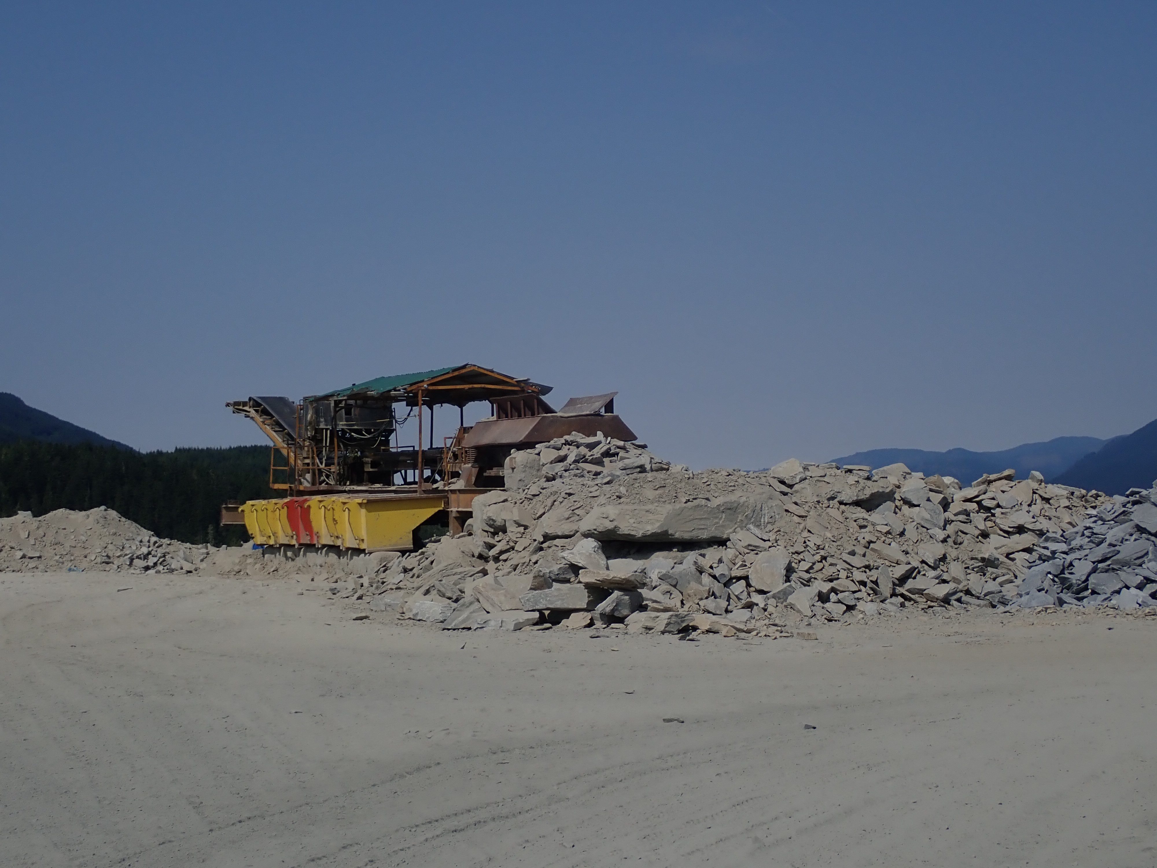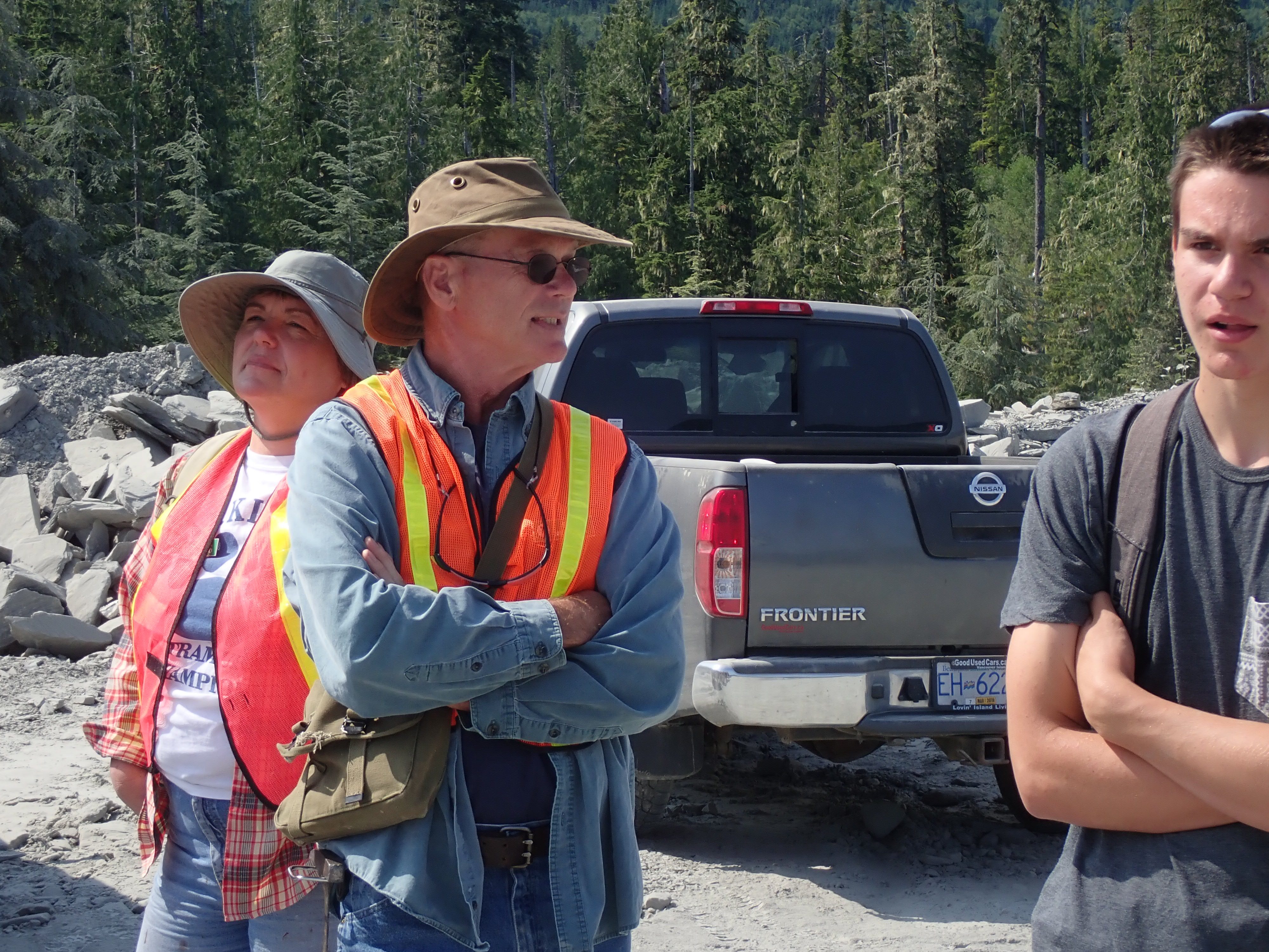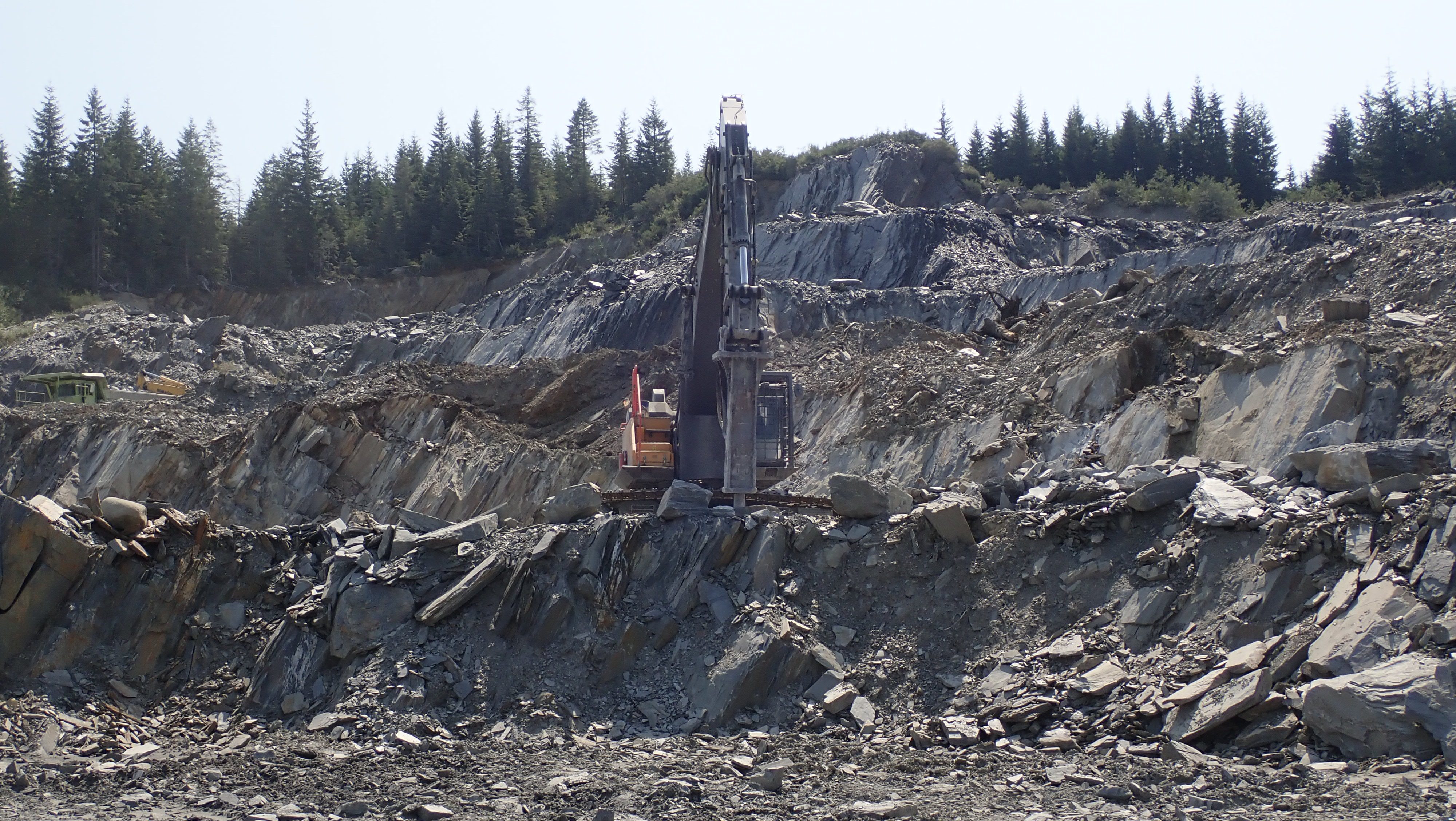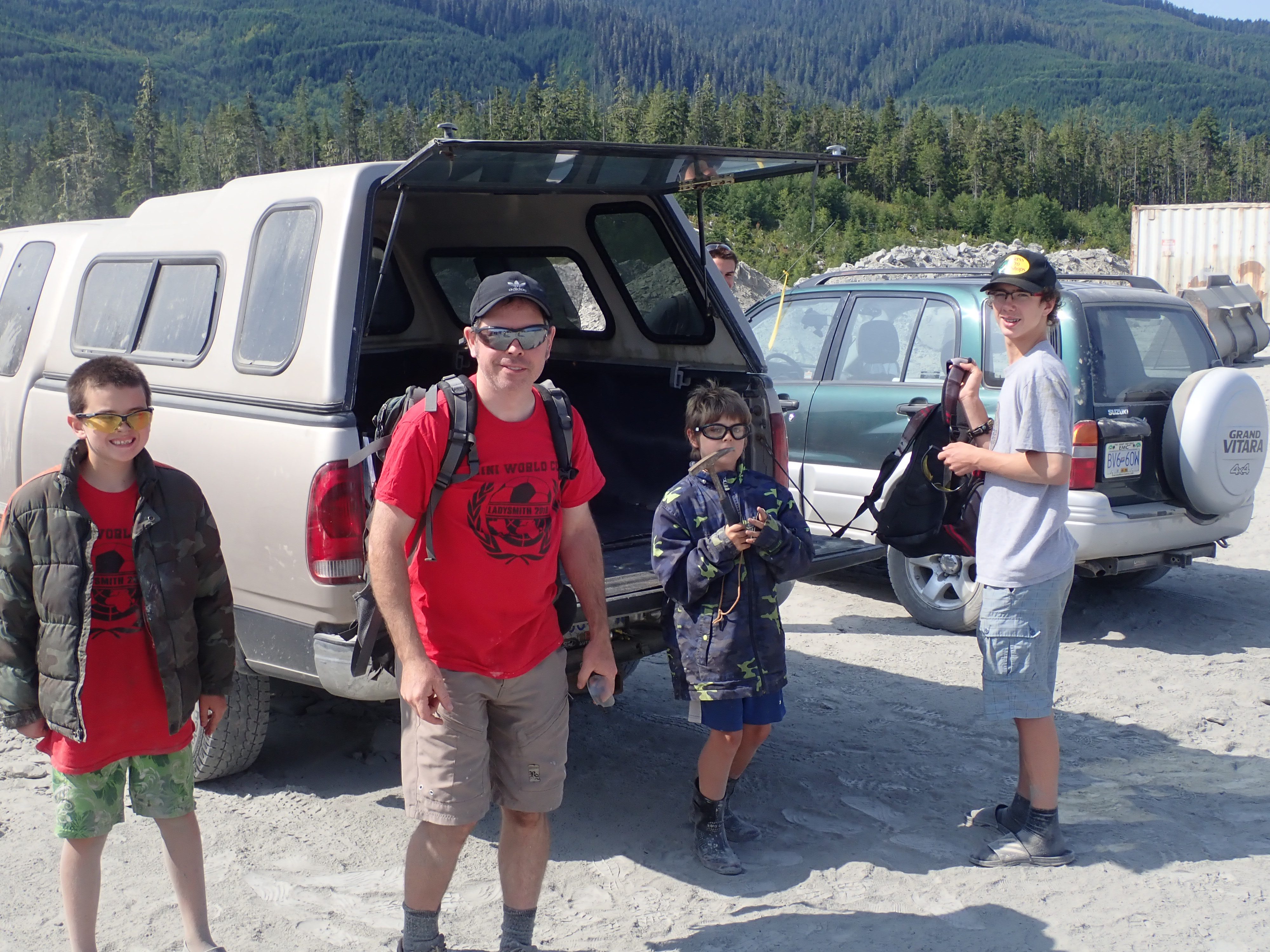 The K2 Quarry is located past Lizard lake on a challenging and extremely dusty logging road.  A convoy of around 12 high-clearance vehicles made the trip, loaded to the gunnels with all who wanted to attend.  We were met for the last segment by Matt Girard from the Nanaimo office of K2 Stone.  In the quarry we had an hour walk-and-talk on how K2 operates. We were allowed to take any sample of rock we could physically carry to our vehicles – which led to some team efforts.
