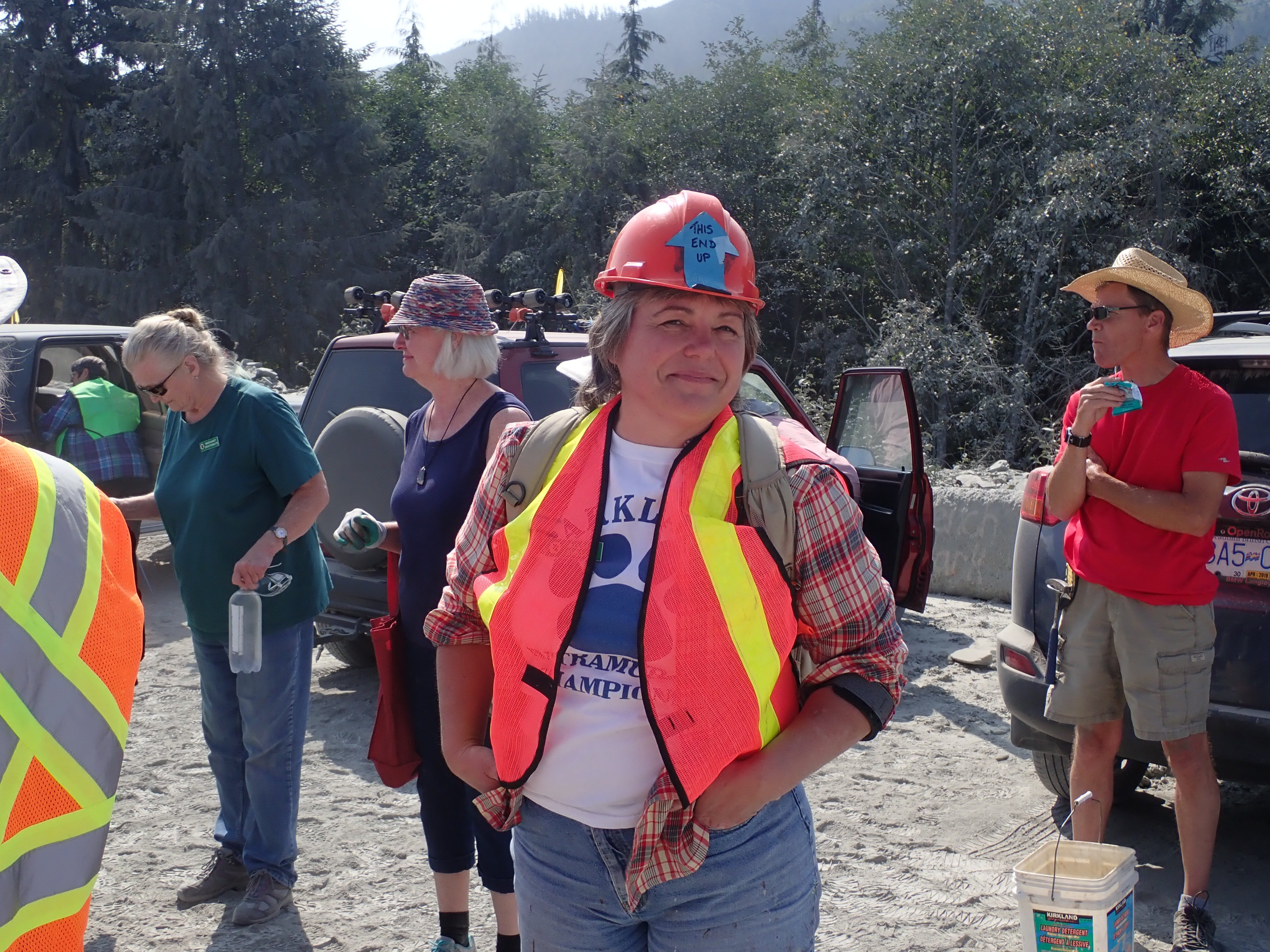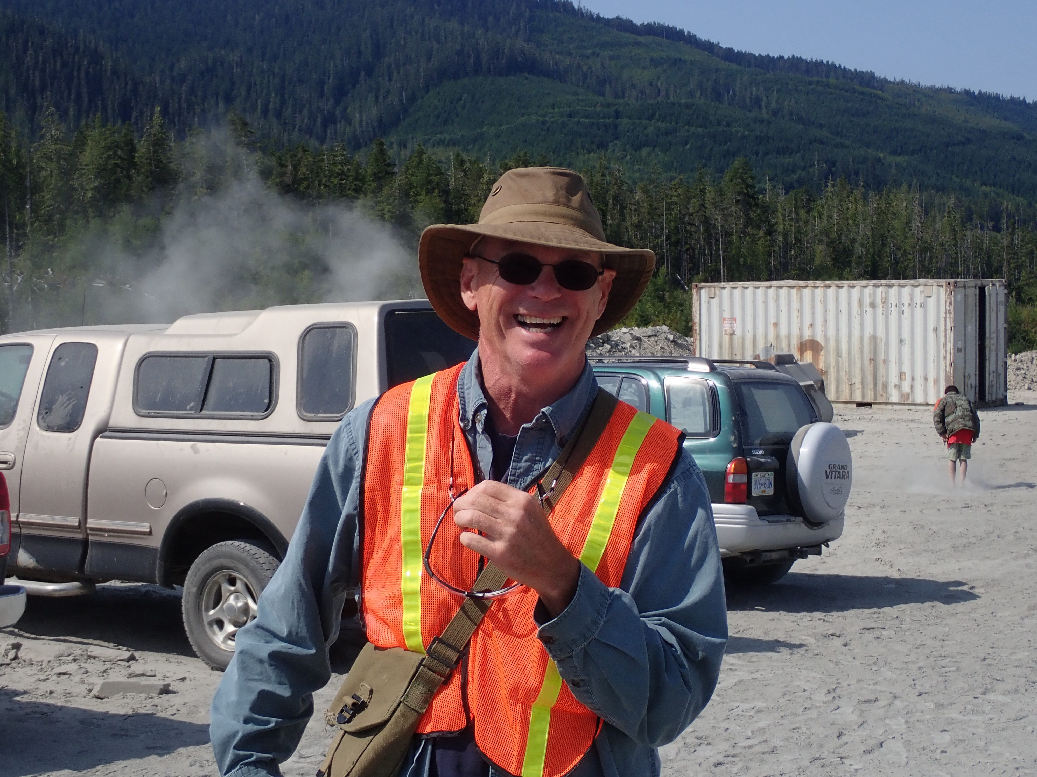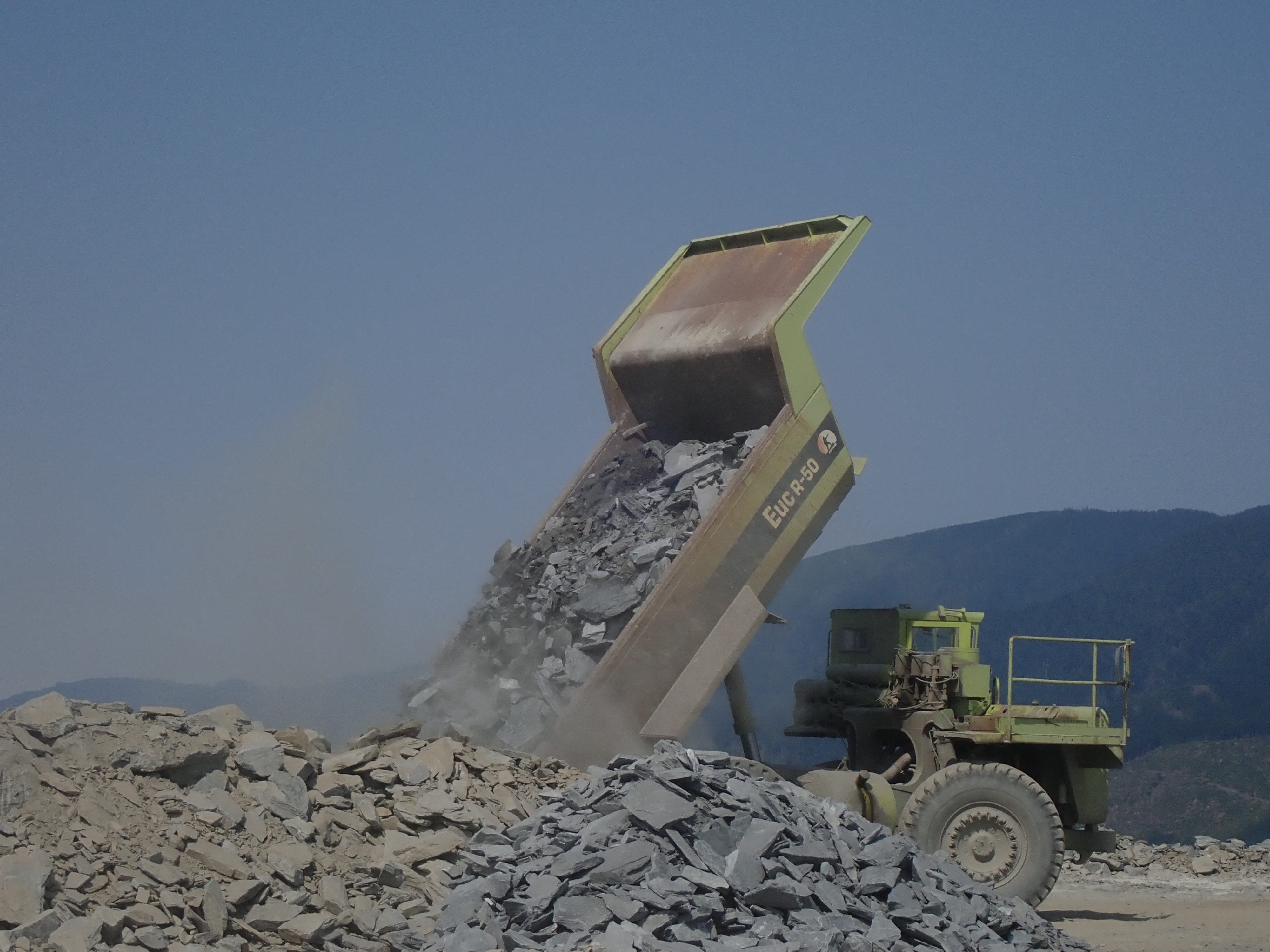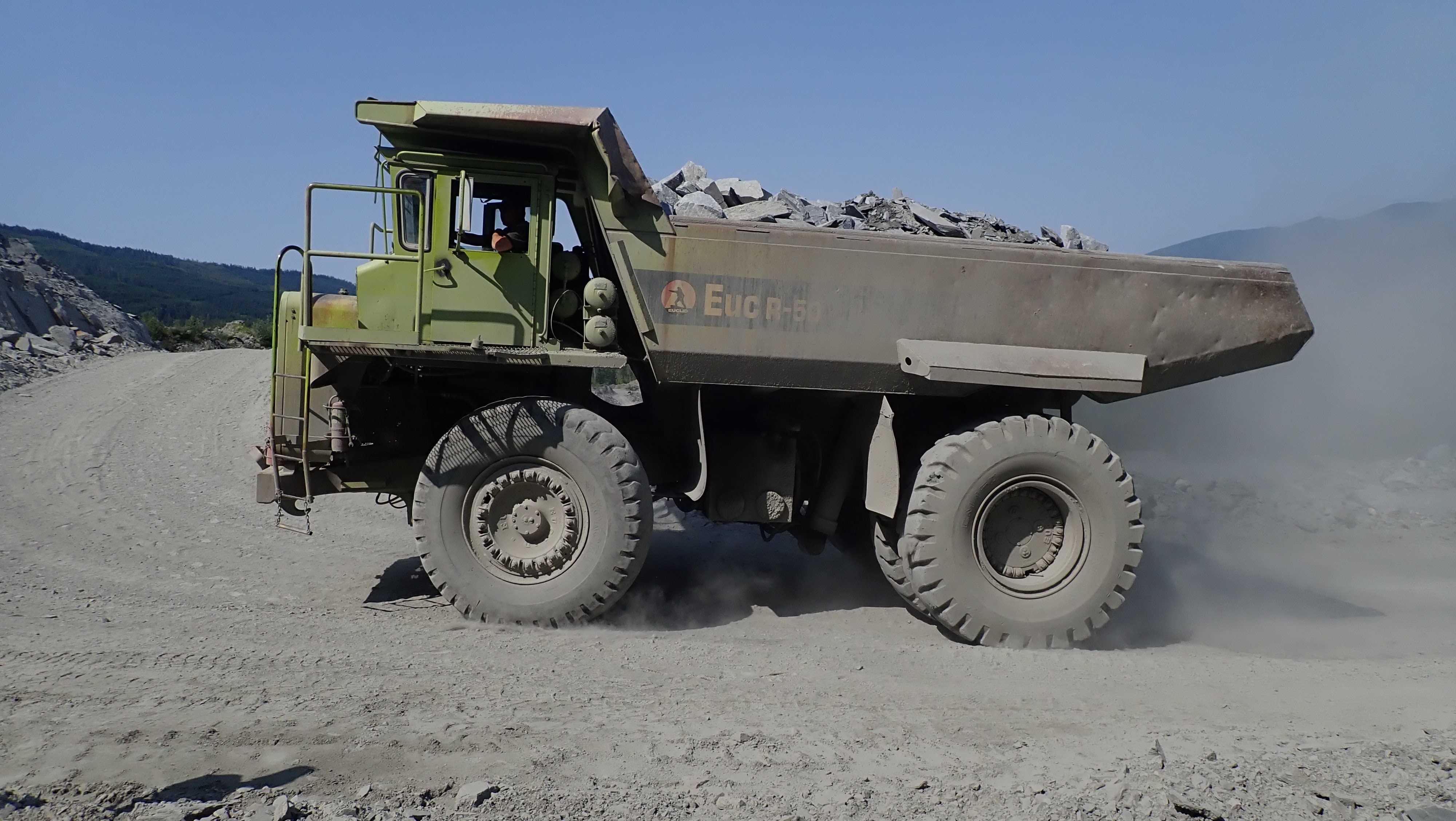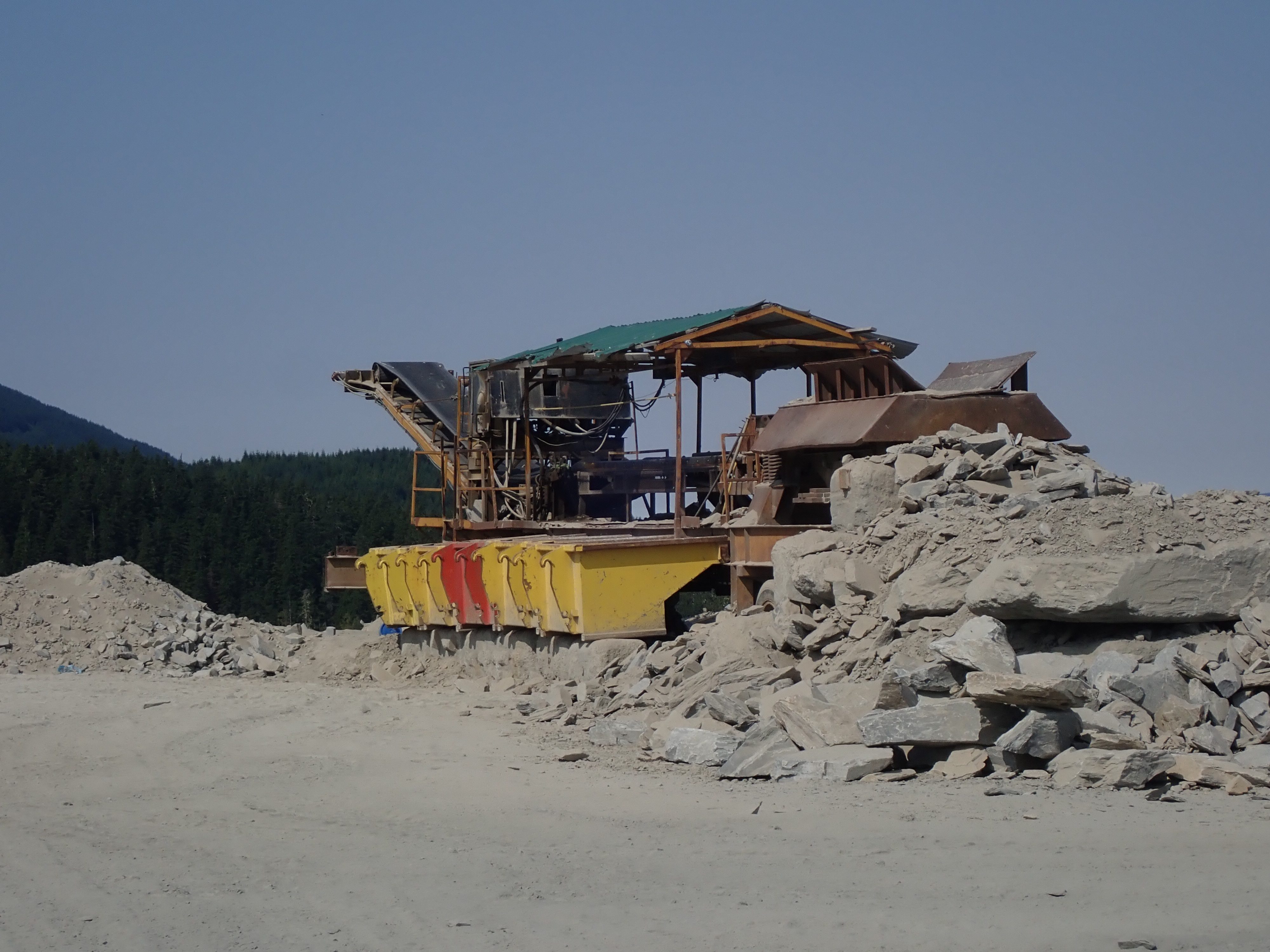 The K2 Quarry is located past Lizard lake on a challenging and extremely dusty logging road.  A convoy of around 12 high-clearance vehicles made the trip, loaded to the gunnels with all who wanted to attend.  We were met for the last segment by Matt Girard from the Nanaimo office of K2 Stone.  In the quarry we had an hour walk-and-talk on how K2 operates. We were allowed to take any sample of rock we could physically carry to our vehicles – which led to some team efforts.