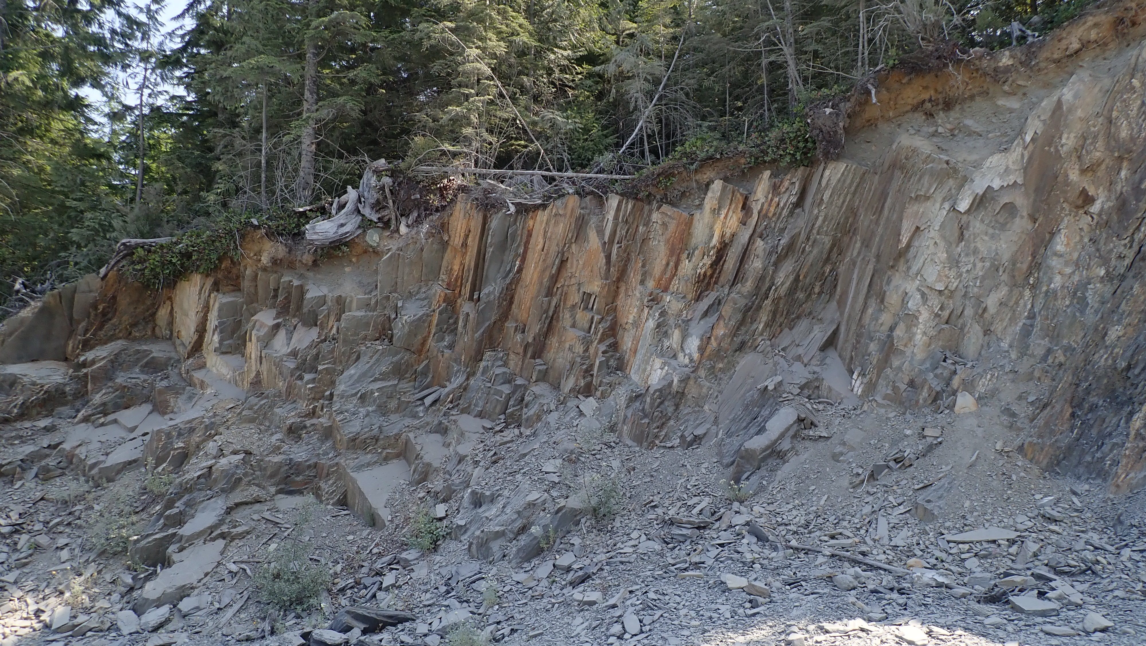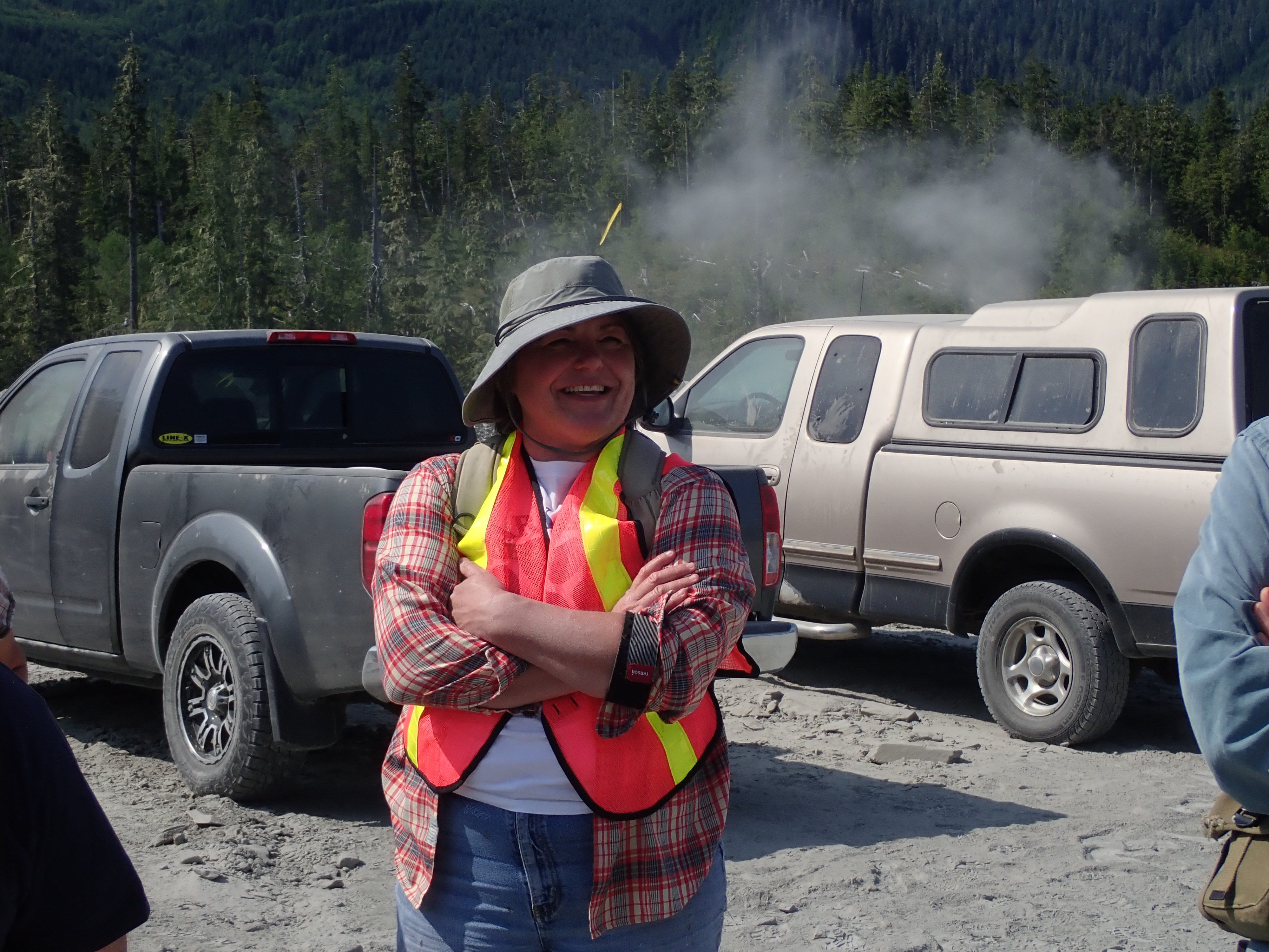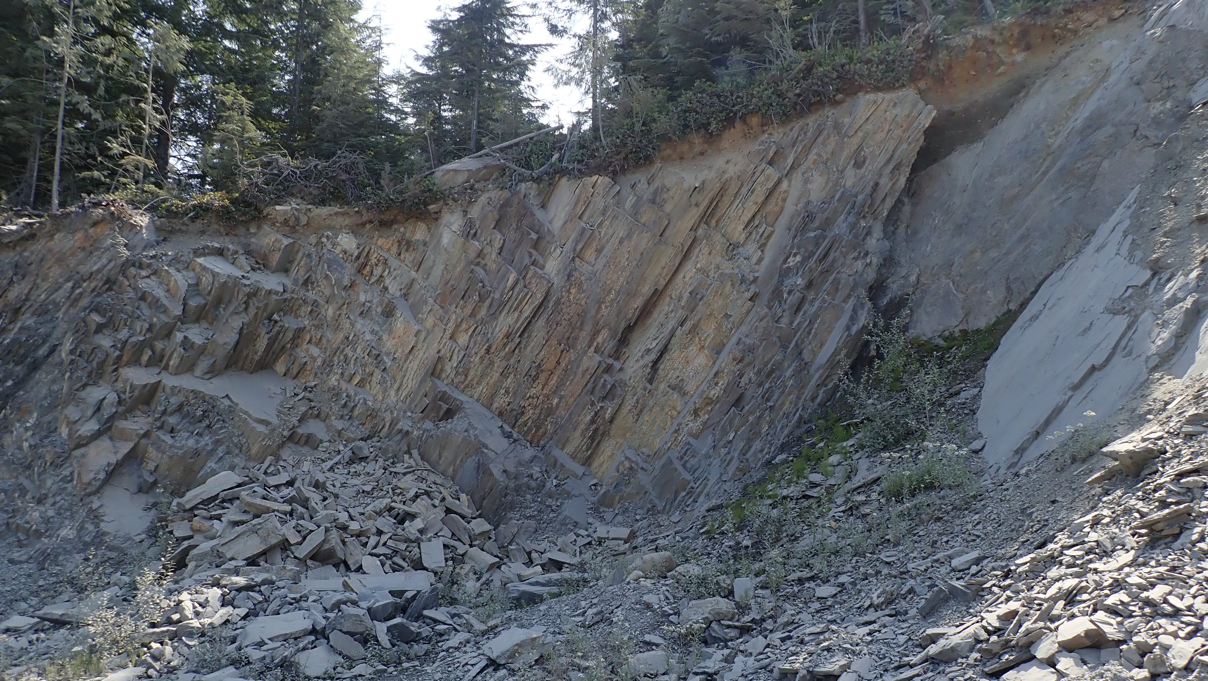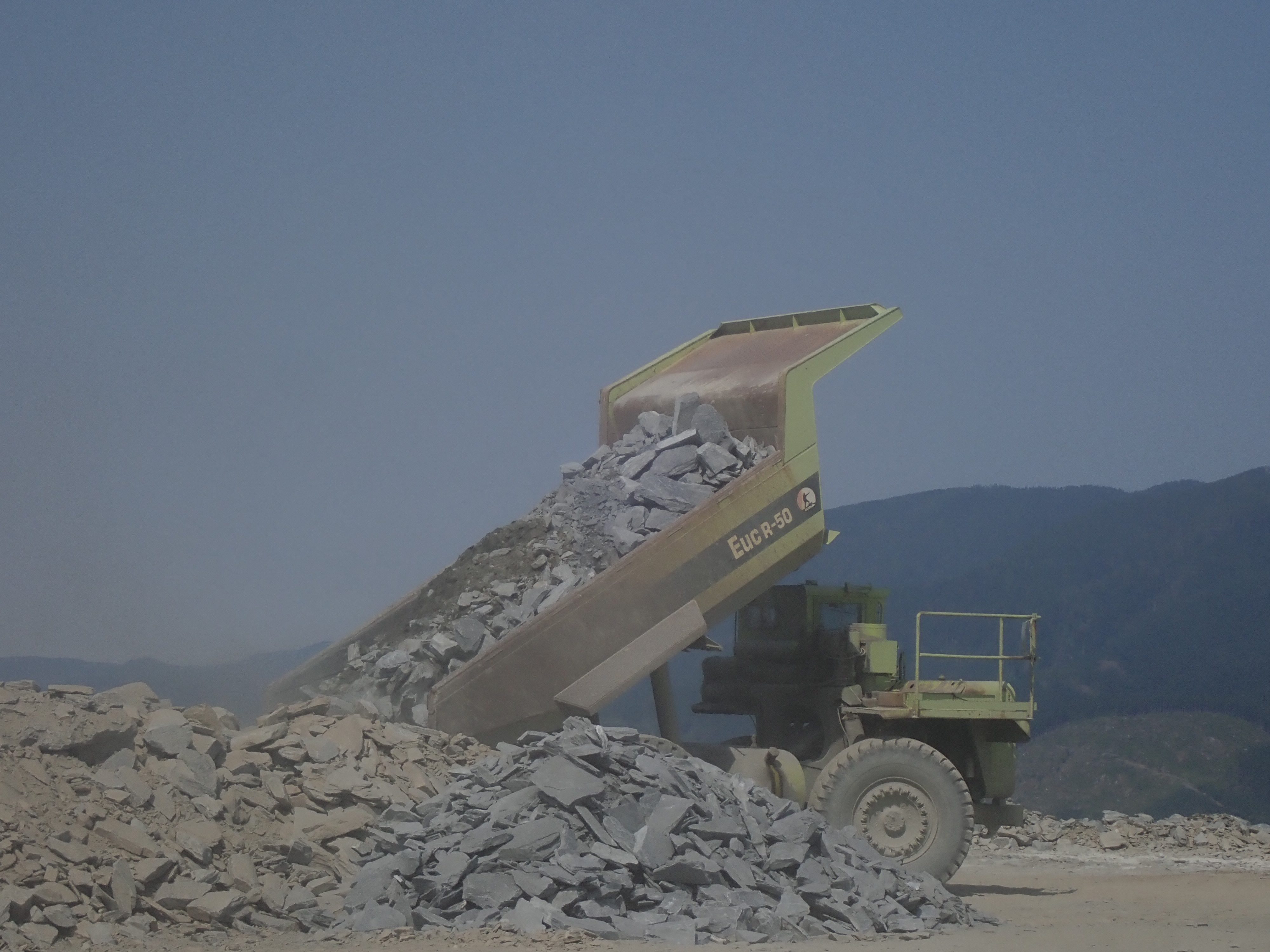 The K2 Quarry is located past Lizard lake on a challenging and extremely dusty logging road.  A convoy of around 12 high-clearance vehicles made the trip, loaded to the gunnels with all who wanted to attend.  We were met for the last segment by Matt Girard from the Nanaimo office of K2 Stone.  In the quarry we had an hour walk-and-talk on how K2 operates. We were allowed to take any sample of rock we could physically carry to our vehicles – which led to some team efforts.