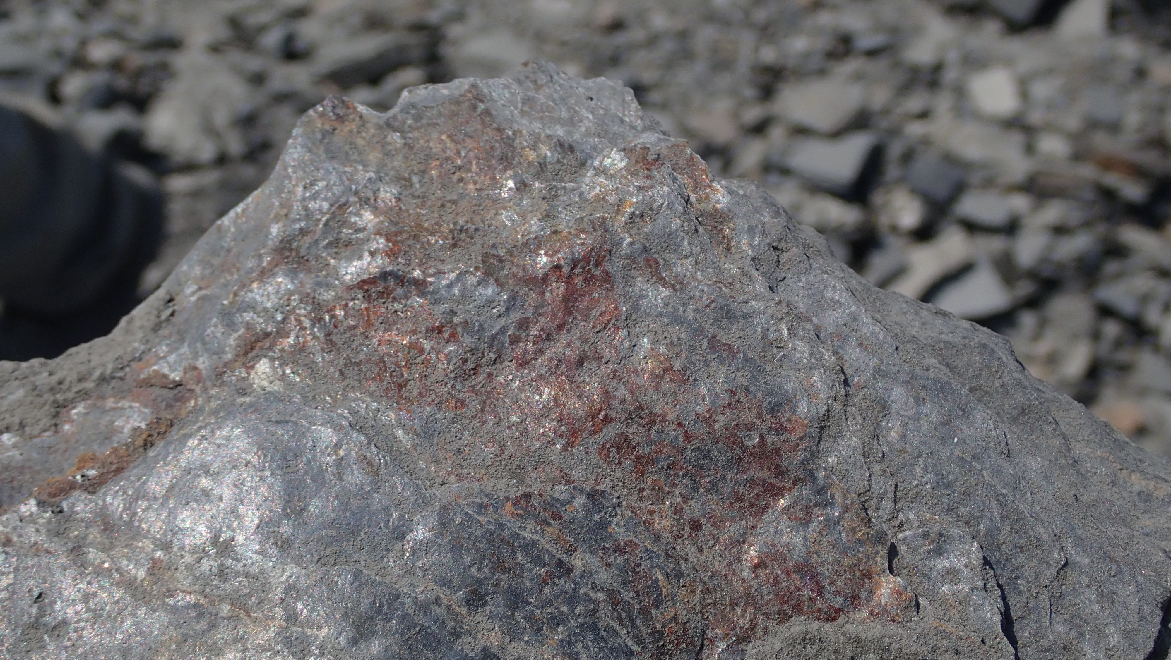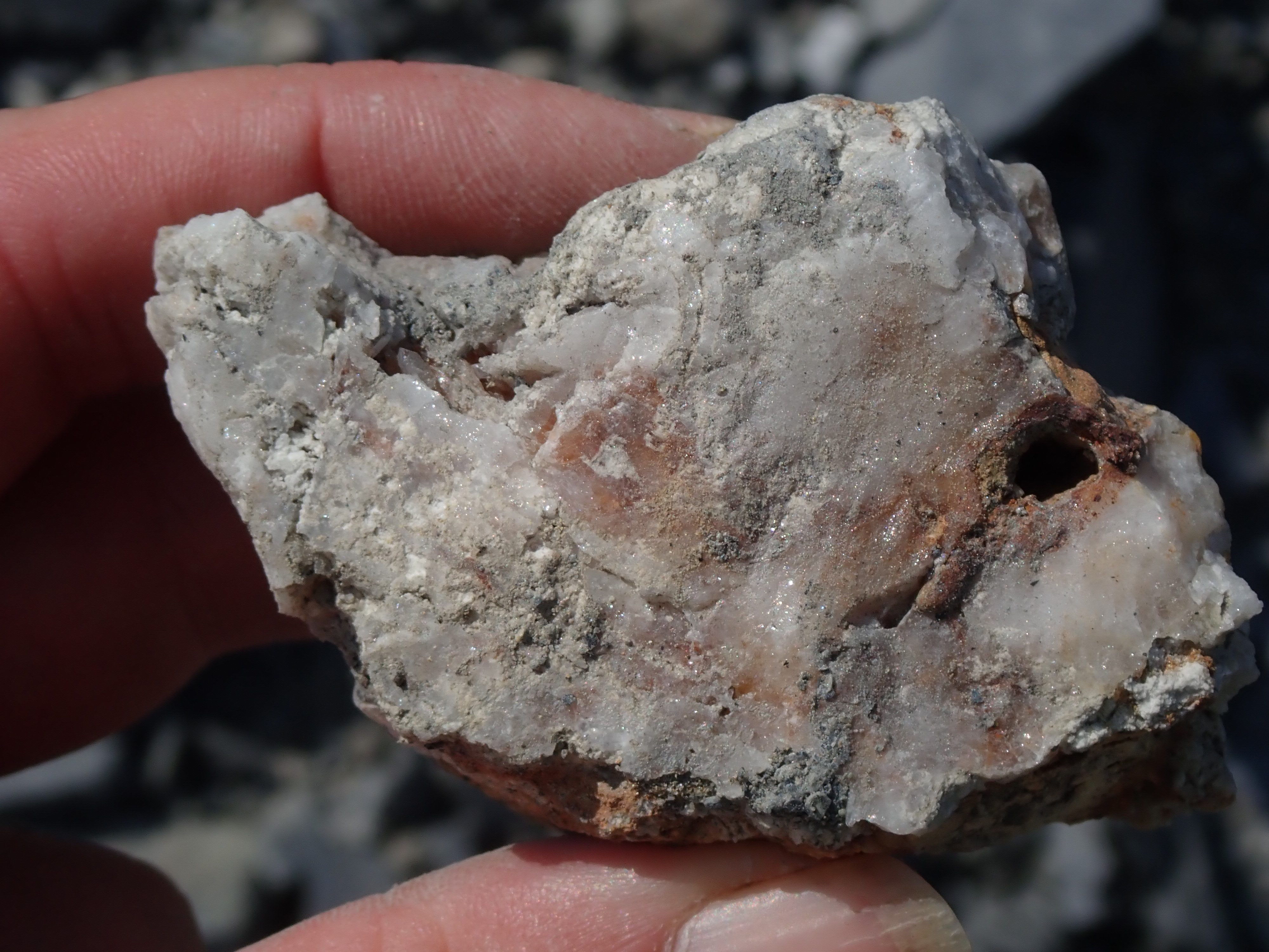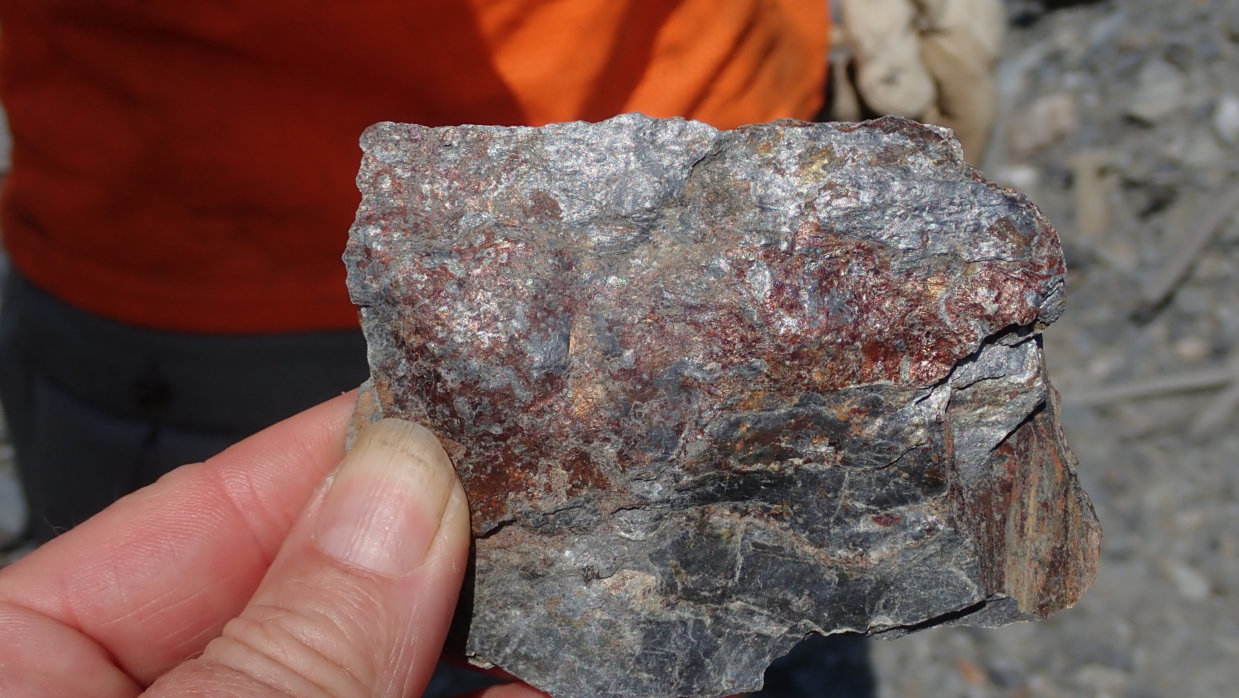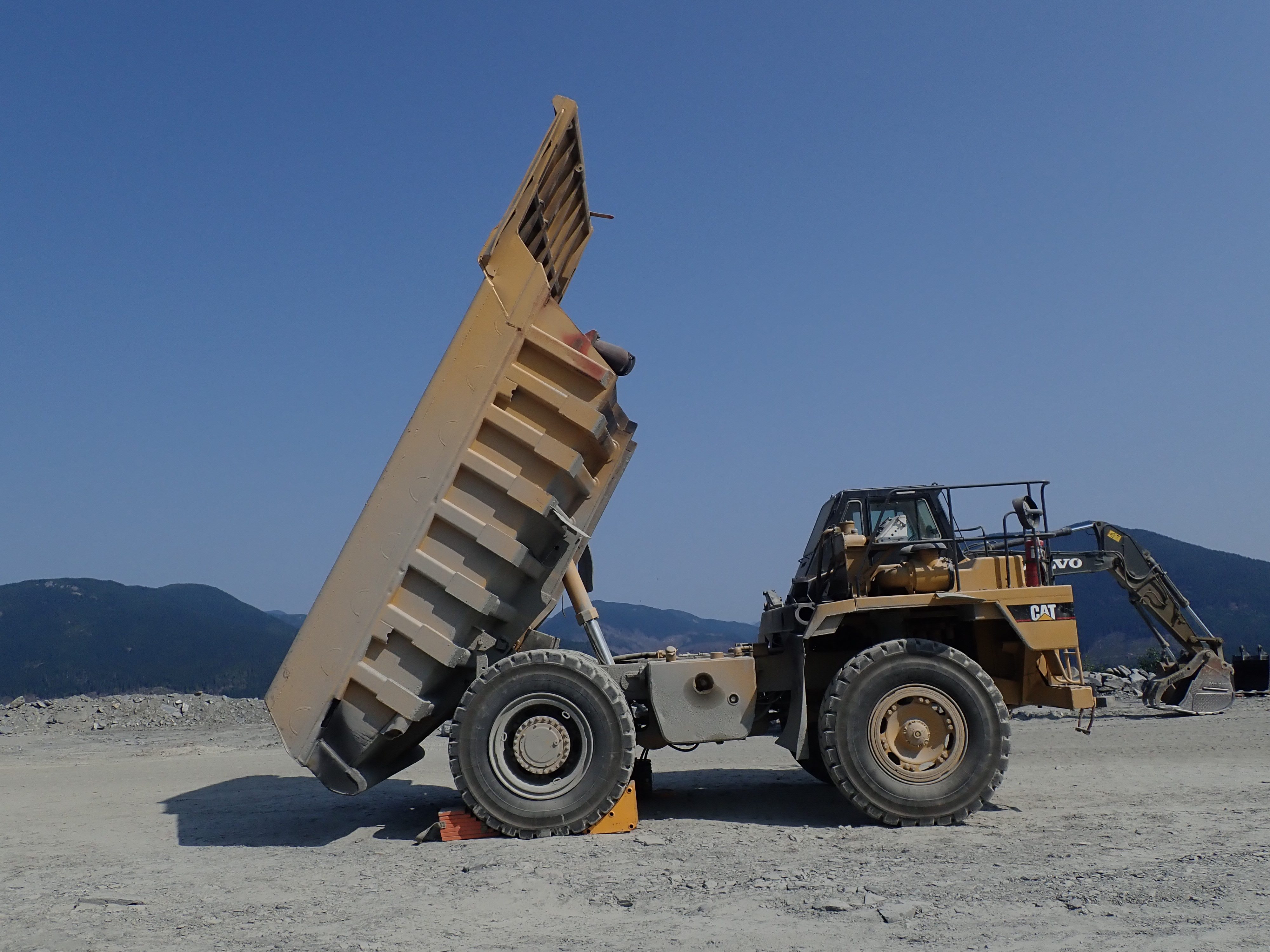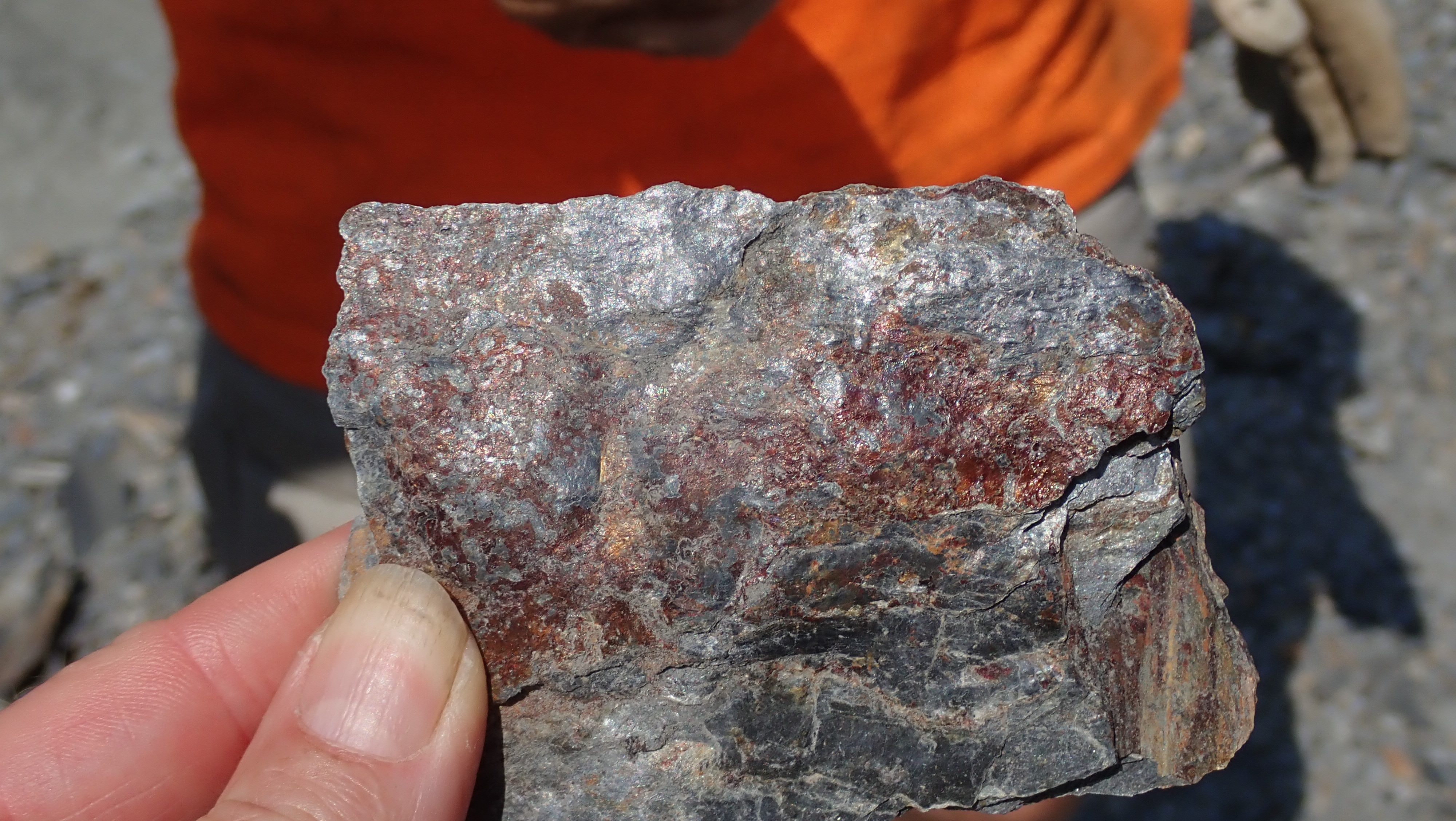 The K2 Quarry is located past Lizard lake on a challenging and extremely dusty logging road.  A convoy of around 12 high-clearance vehicles made the trip, loaded to the gunnels with all who wanted to attend.  We were met for the last segment by Matt Girard from the Nanaimo office of K2 Stone.  In the quarry we had an hour walk-and-talk on how K2 operates. We were allowed to take any sample of rock we could physically carry to our vehicles – which led to some team efforts.