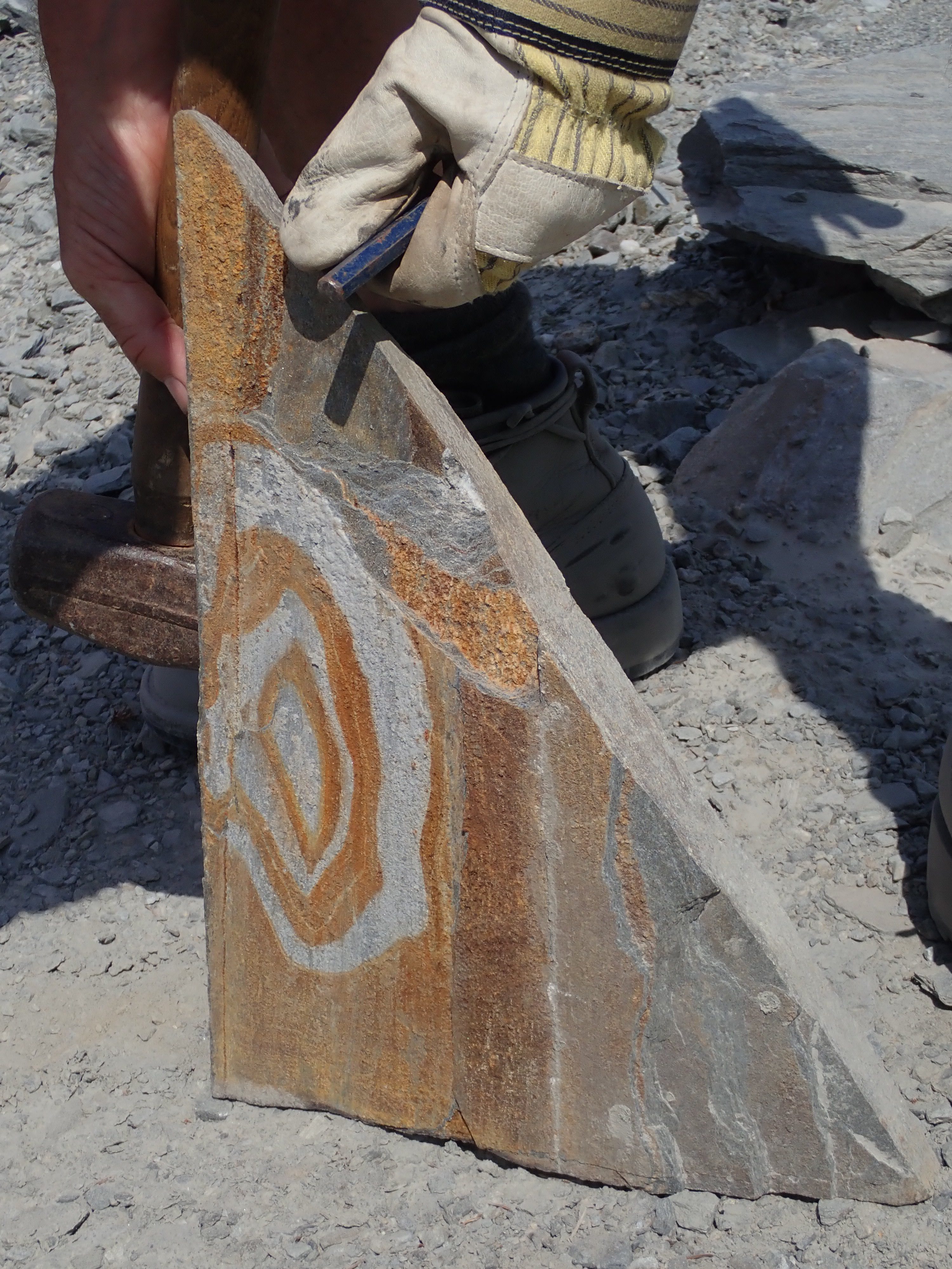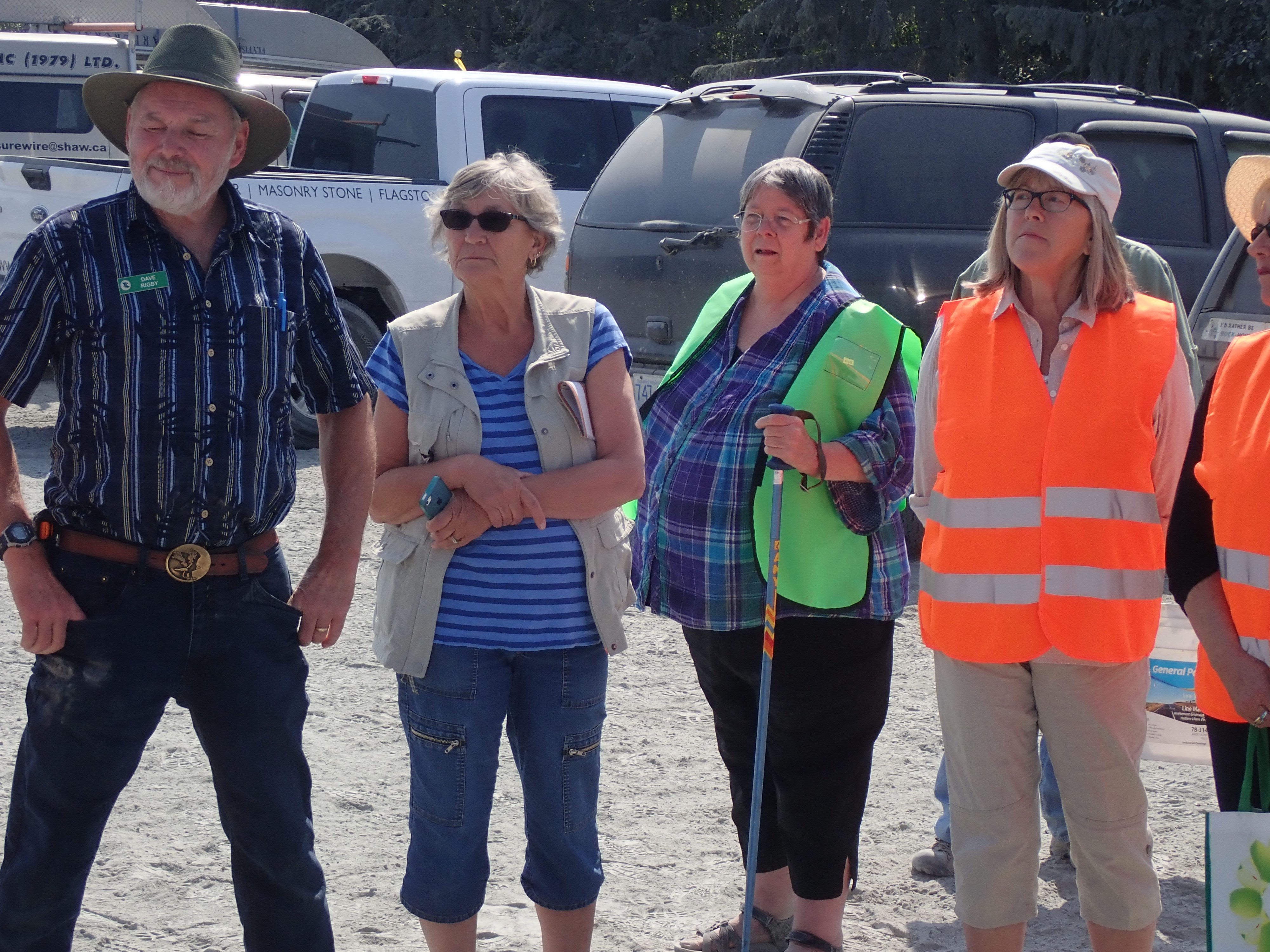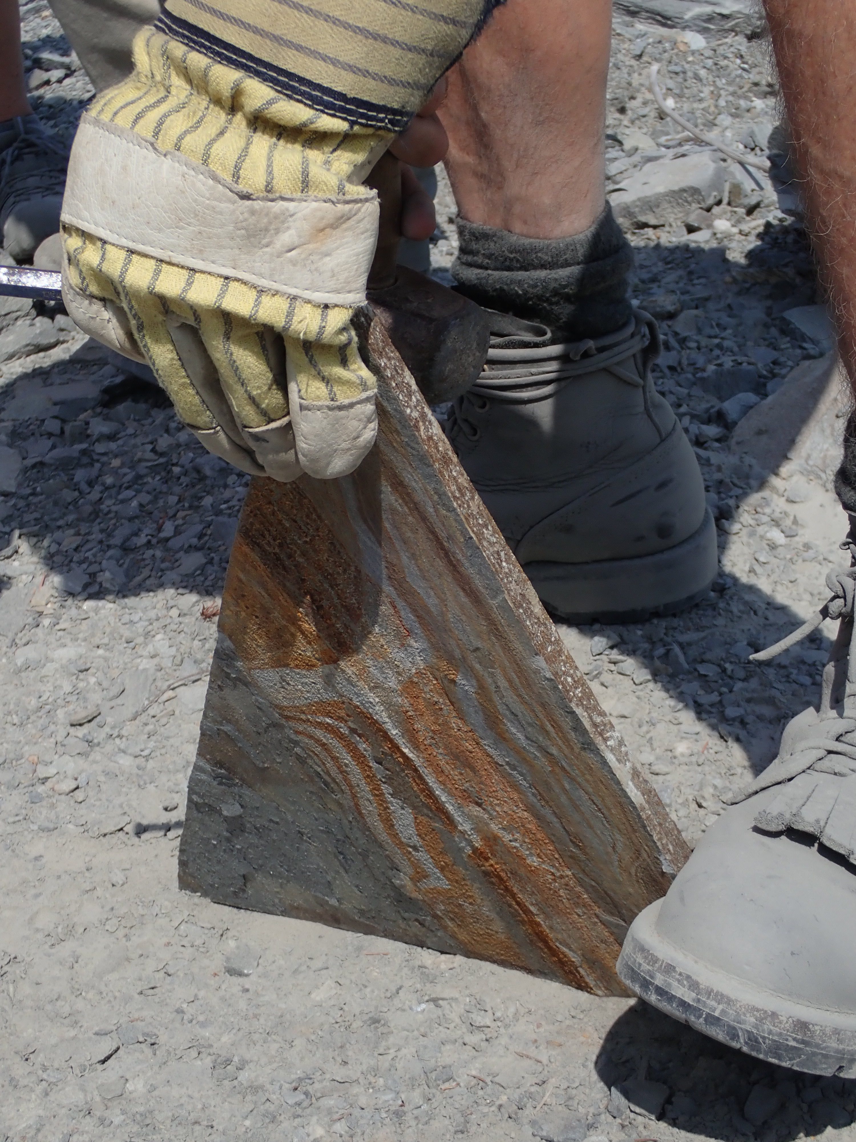 The morning was hot and filled with anticipation as our newly-appointed wagon master Bill Needoba led us to the K2 Ocean Pearl Quarry on Mosquito Creek near Port Renfrew. There we learned that K2 has 3 different kinds of slate at their quarry: (i) black, oily slate – good for construction and aggregate material, (ii) a light blue-gray, and (iii) a dark gray. Both the latter two types are desirable for stone products. Matt Girard was our guide and explained all the processes needed to take the stone out of the ground and then to market. Any excess or unwanted material is used in conjunction with concrete and other aggregate, so nothing is wasted. Our afternoon was spent gold-panning in more temperate climes at Loss Creek. The water was definitely welcomed in comparison to our dry hot morning quarry run. Several participants found “colour” in their pans and some were able to do rock hounding in the creek as well. The Friday agenda was ended with a steak BBQ put on by the Sooke Lions and with an arrow-knapping demonstration by our very own Bruzz Bethel.