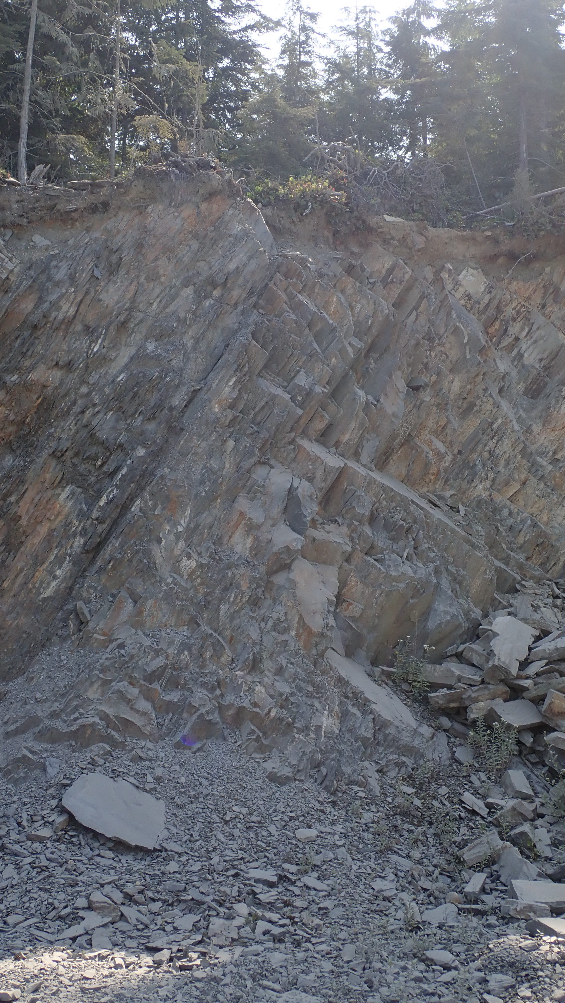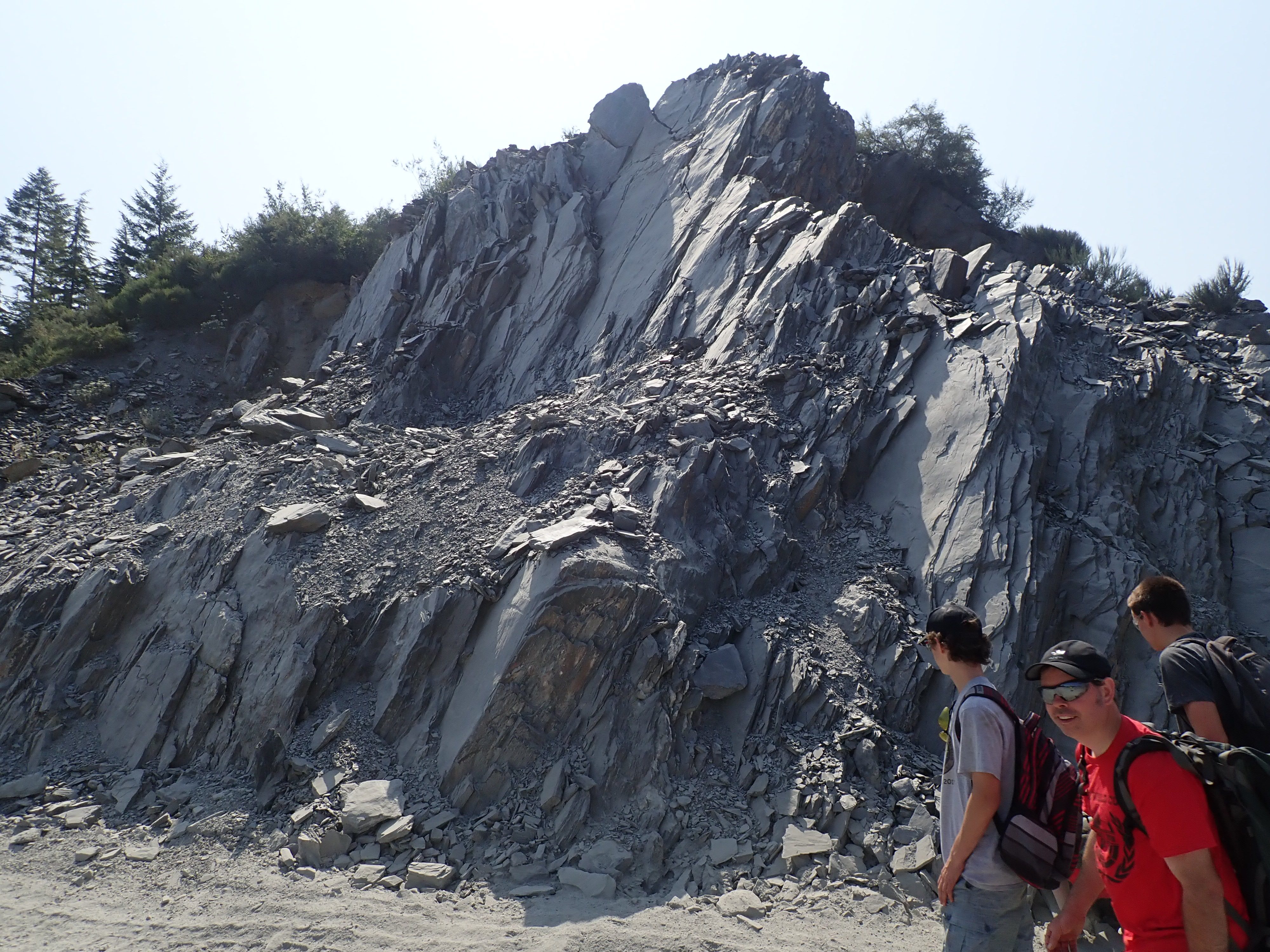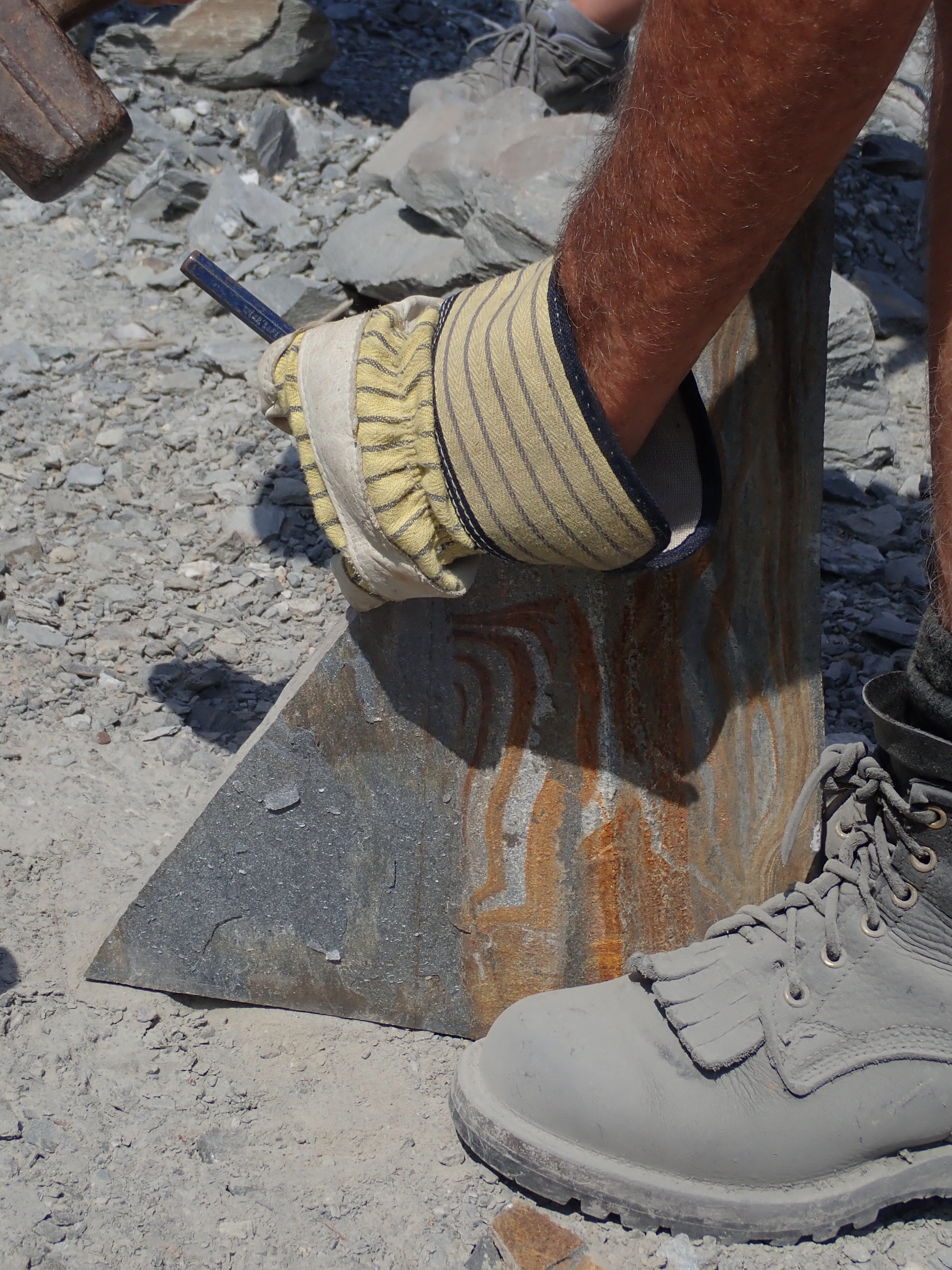 The morning was hot and filled with anticipation as our newly-appointed wagon master Bill Needoba led us to the K2 Ocean Pearl Quarry on Mosquito Creek near Port Renfrew. There we learned that K2 has 3 different kinds of slate at their quarry: (i) black, oily slate – good for construction and aggregate material, (ii) a light blue-gray, and (iii) a dark gray. Both the latter two types are desirable for stone products. Matt Girard was our guide and explained all the processes needed to take the stone out of the ground and then to market. Any excess or unwanted material is used in conjunction with concrete and other aggregate, so nothing is wasted. Our afternoon was spent gold-panning in more temperate climes at Loss Creek. The water was definitely welcomed in comparison to our dry hot morning quarry run. Several participants found “colour” in their pans and some were able to do rock hounding in the creek as well. The Friday agenda was ended with a steak BBQ put on by the Sooke Lions and with an arrow-knapping demonstration by our very own Bruzz Bethel.