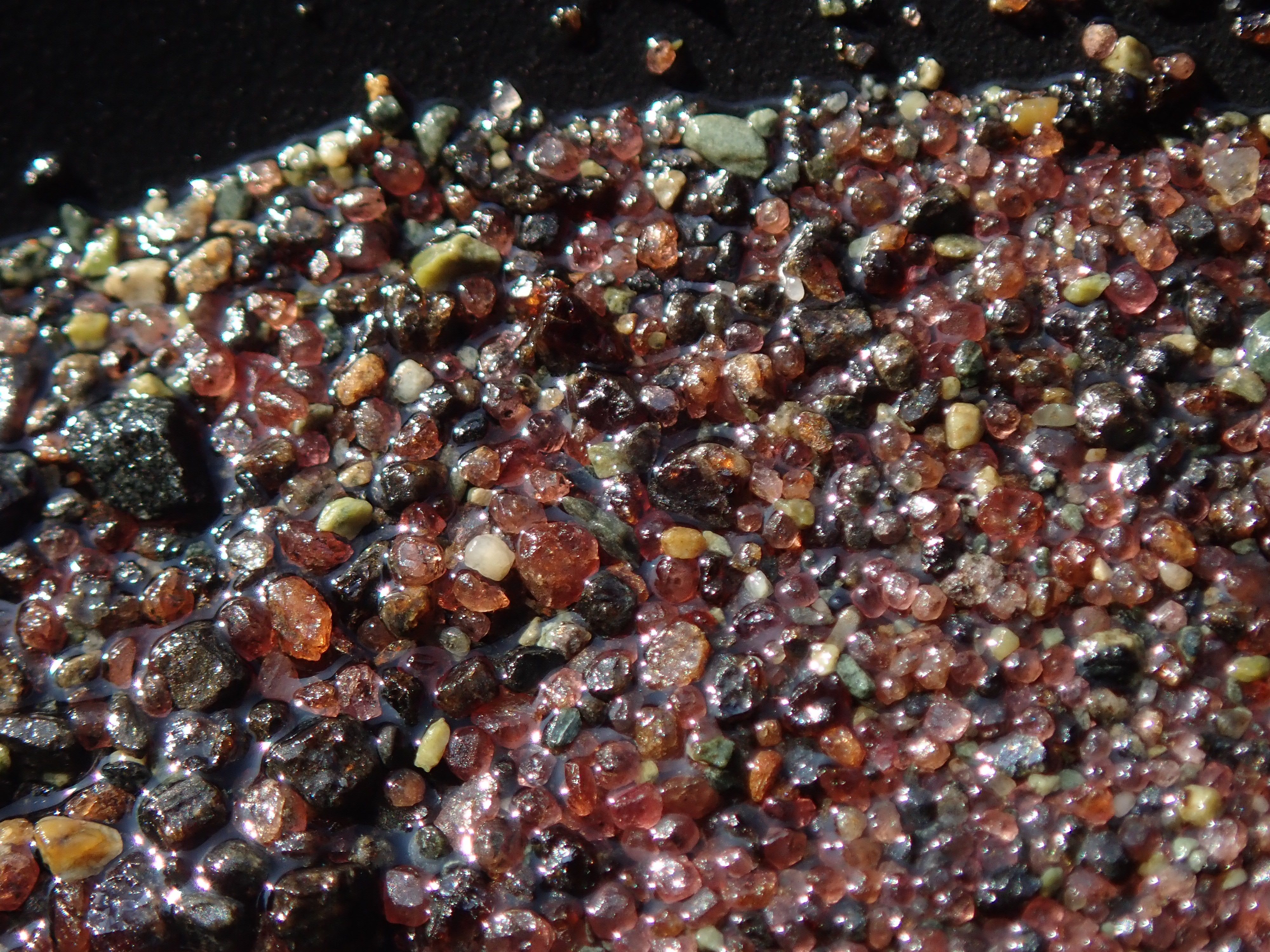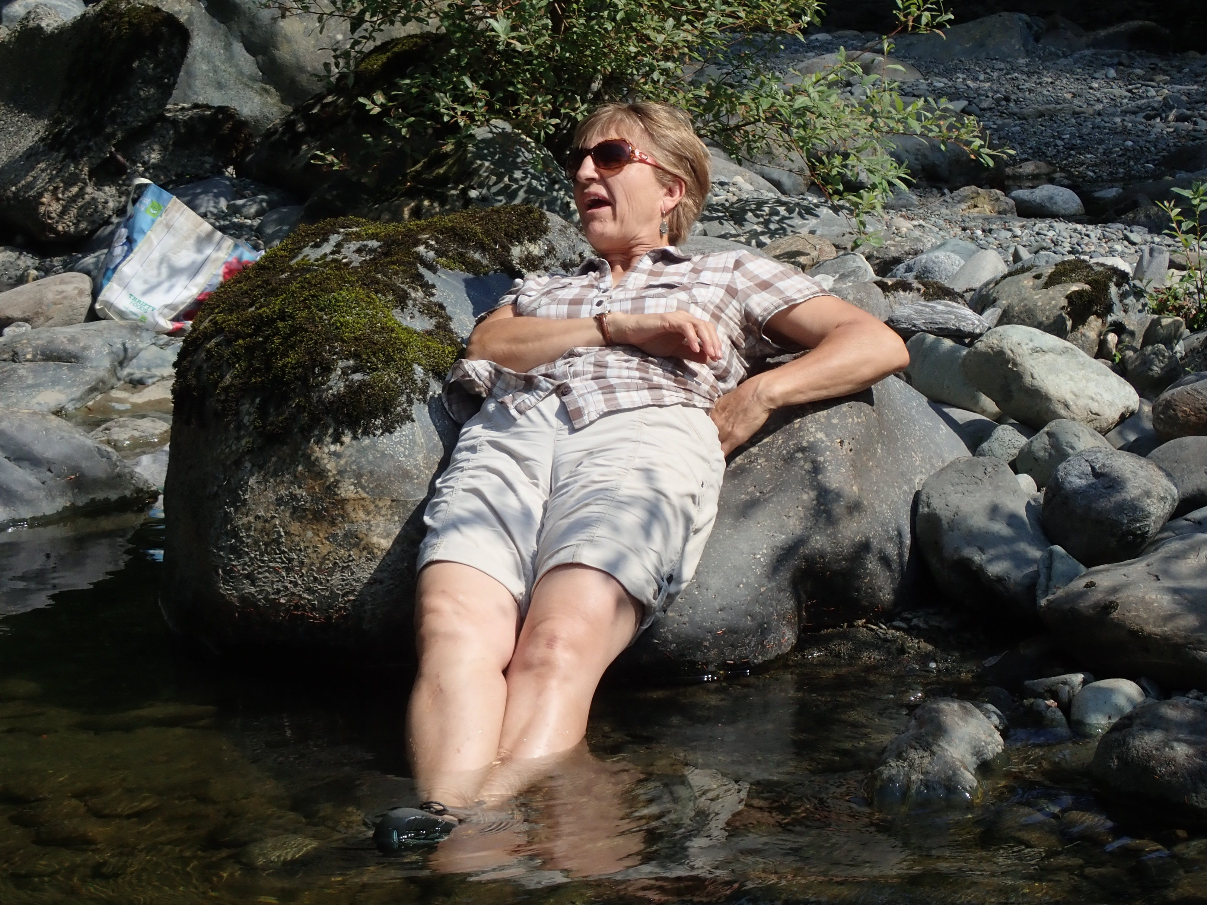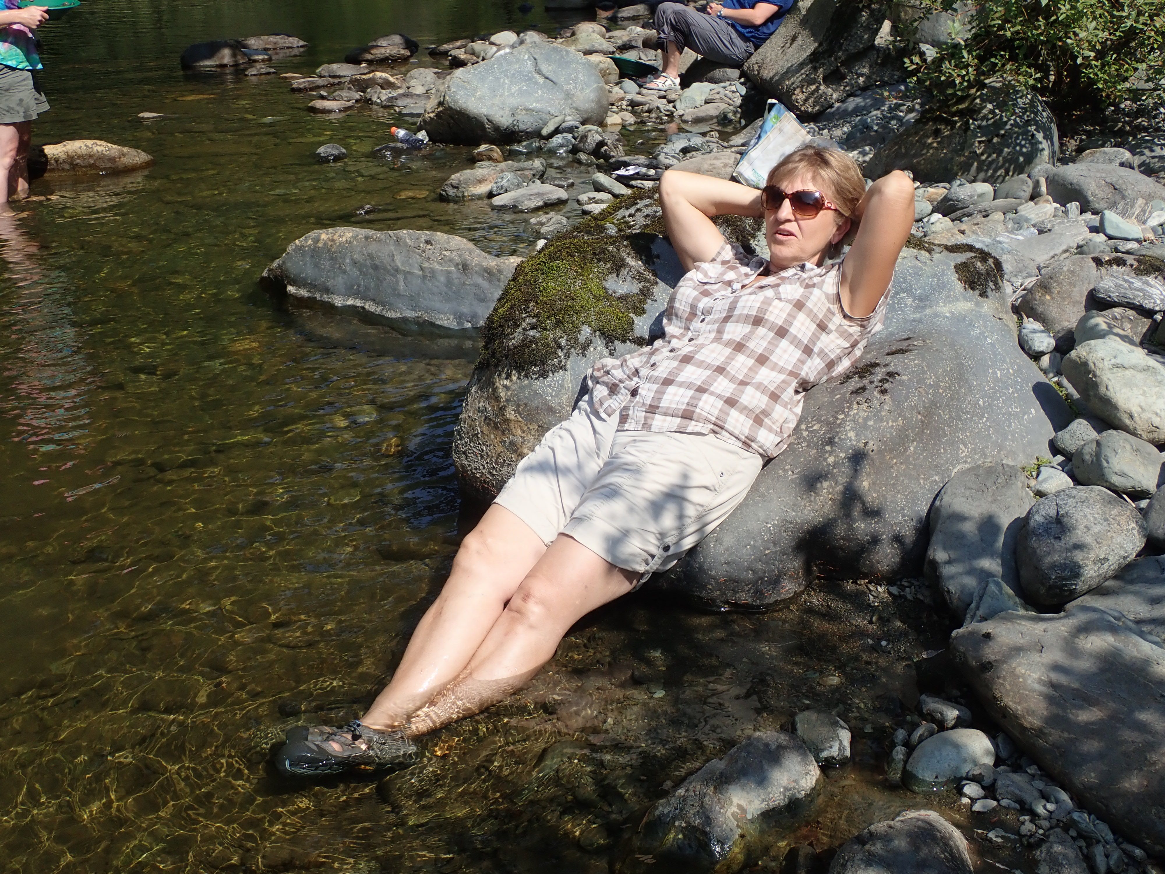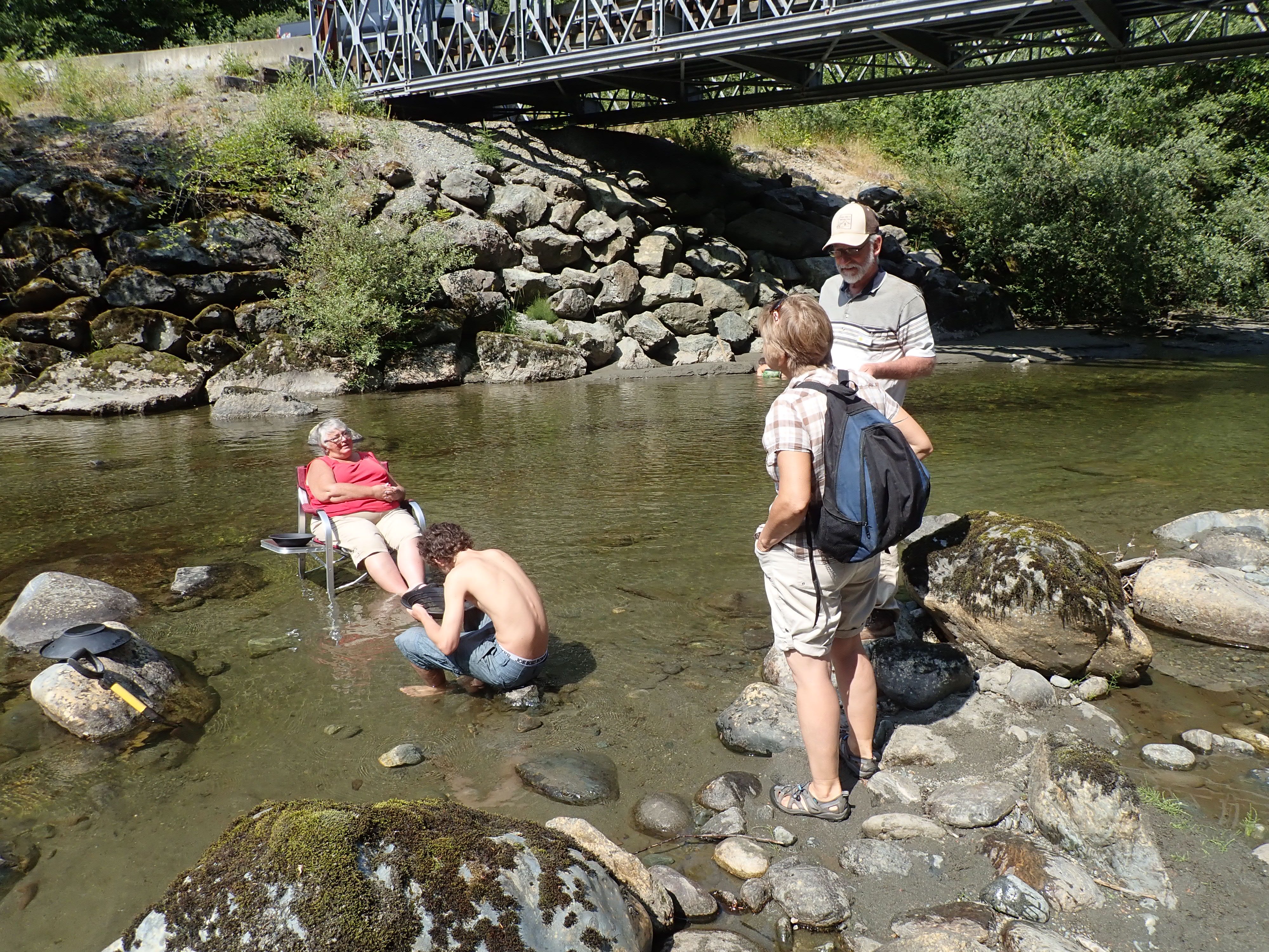Patrick Lydon (of the Victoria LMS) let us try panning on his claim on Loss Creek.  After the hot and dusty quarry the latecomers seemed just as interested in dangling their toes in the water as in searching for gold.  Nevertheless some people found a few flakes of actual gold.  Almost as much fun were the garnets to be found all down the creek which conveniently collected in the panning pans.
