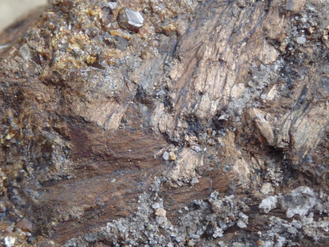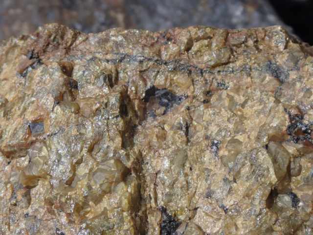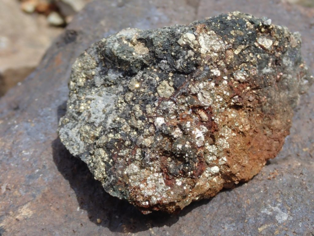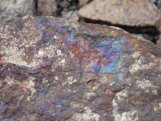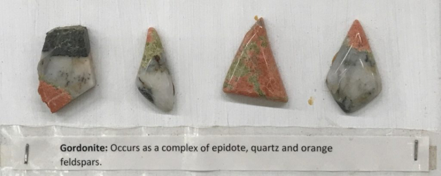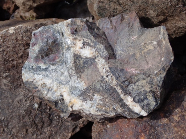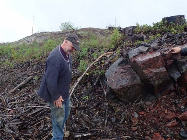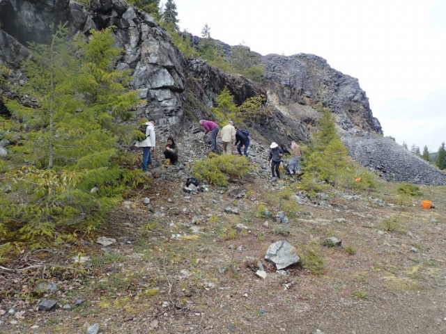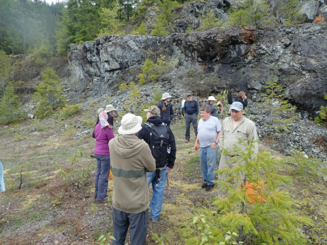 The Argonaut mine is an idle open pit iron mine. Active from 1951 until 1957 its minerals were used in the steel manufacturing industry. Minerals to be found are magnetite, garnet skarn, epidote skarn, calcite, marble, pyrite, limestone, diorite and actinolite. The trip was led by Jim McKinnon (Parksville club) who provided good interpretation of what was available and how to find it.