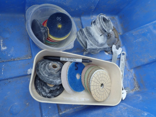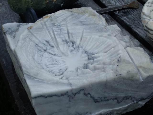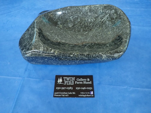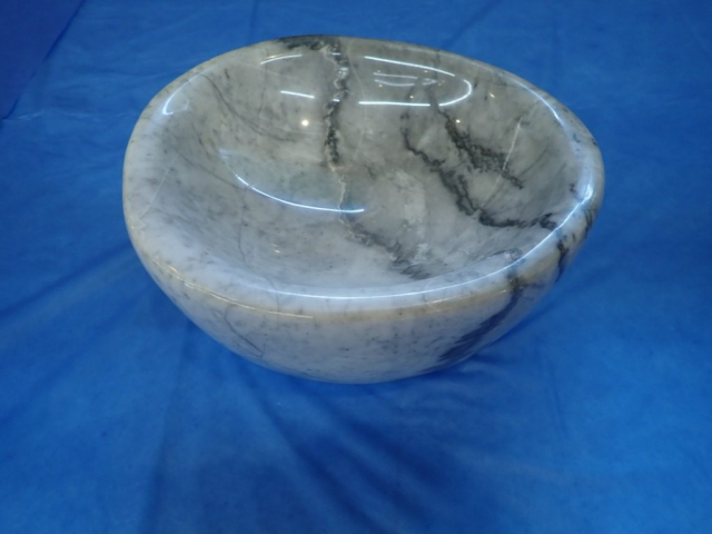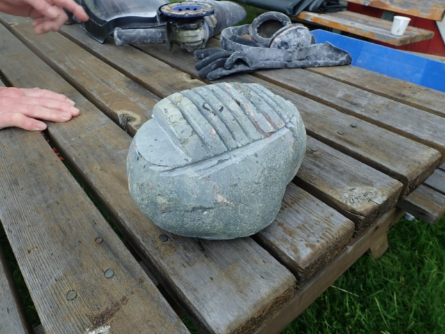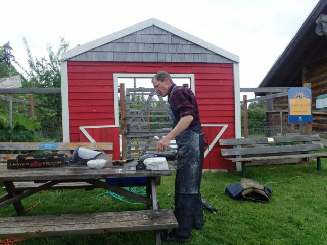 Gary Veitch from the Duncan club demonstrated how he carves rock bowls. He uses a Makita Wet Stone polisher that he has modified to keep the powdered rock out of the workings. Gary shapes and sands the outside before starting on the inside. It takes a couple of days to produce a finished bowl from a rock.
