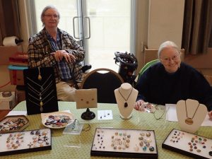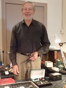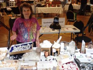 Brian and Rose Marie (VLMS). Brian specializes in REALLY SMALL cabs! He’s never met a rock chip he didn’t like. On his table is a year’s worth of finished cabouchons and projects in progress. He’s also demonstrating cabbing on a Genie 6-wheel machine.