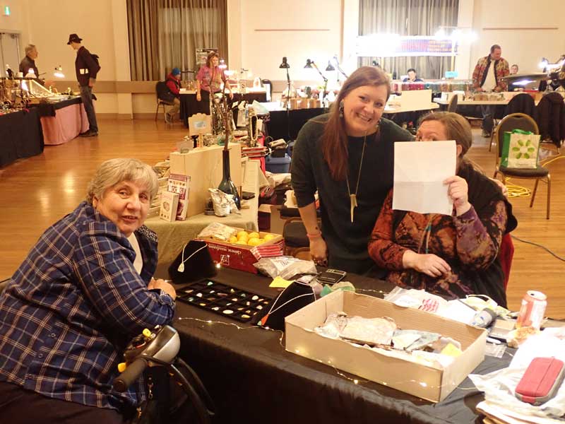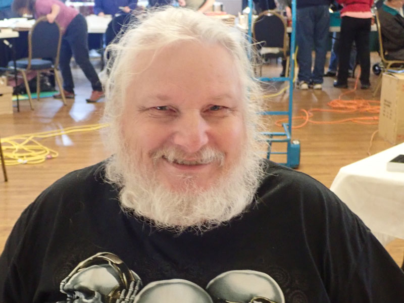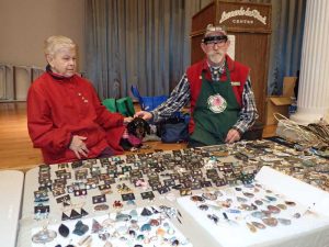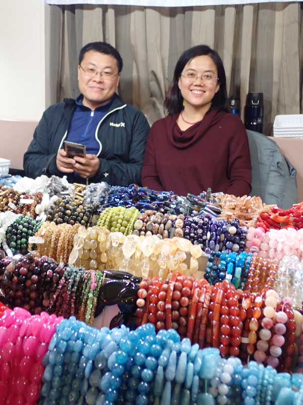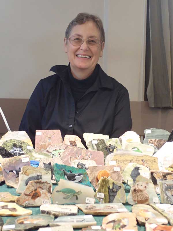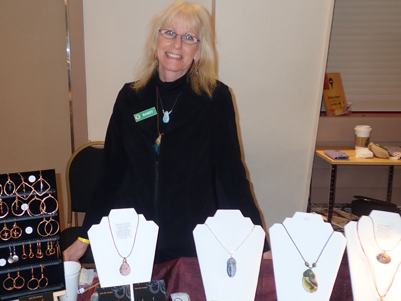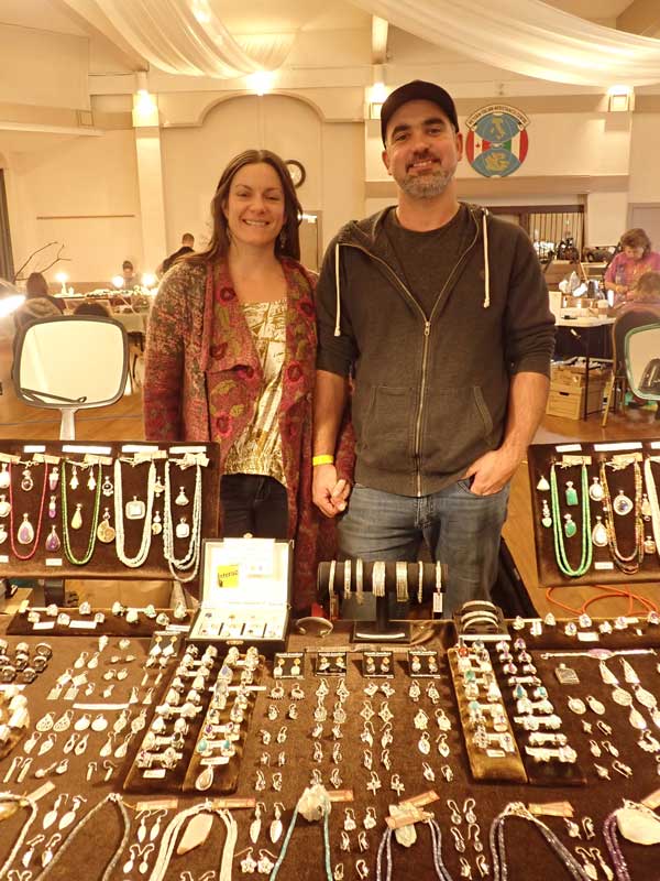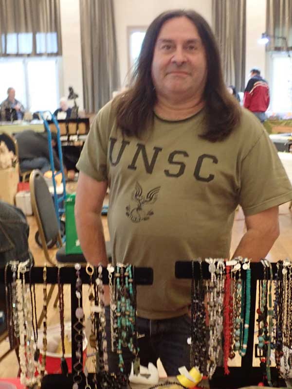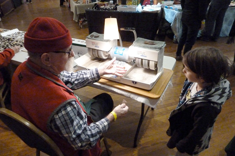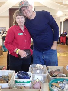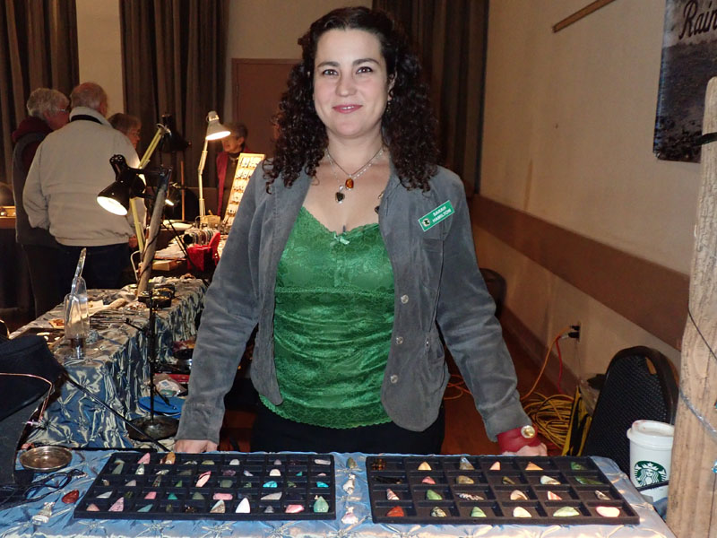 Brian and Rose Marie (VLMS). Brian specializes in REALLY SMALL cabs! He’s never met a rock chip he didn’t like. On his table is a year’s worth of finished cabouchons and projects in progress. He’s also demonstrating cabbing on a Genie 6-wheel machine.