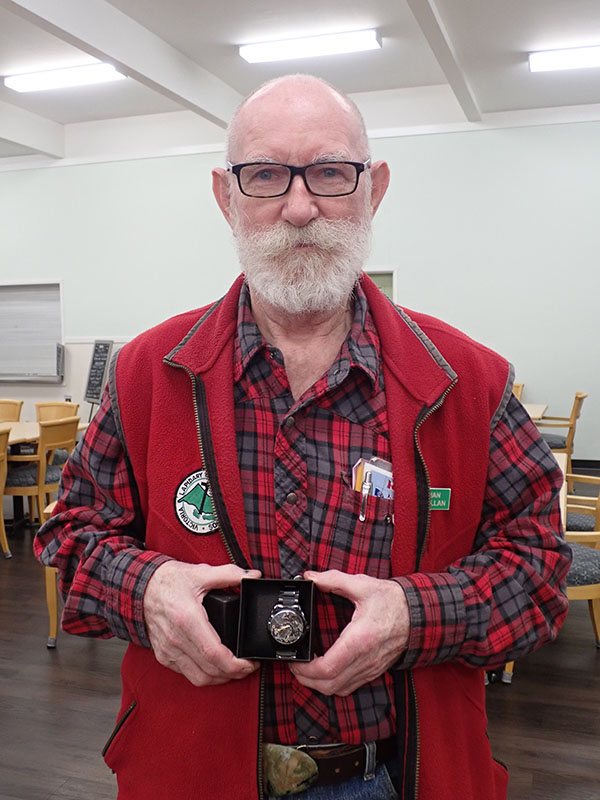 At the AGM Brian MacMillan was presented with Dallasite-face wrist watch and Giles LeBrun was presented with a Dallasite-face pocket watch for their years of service to the club. The watches were made by club member Doug Smith.