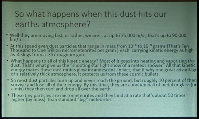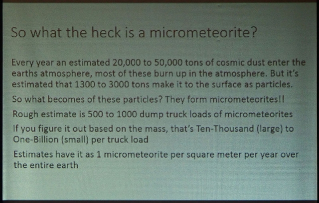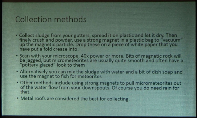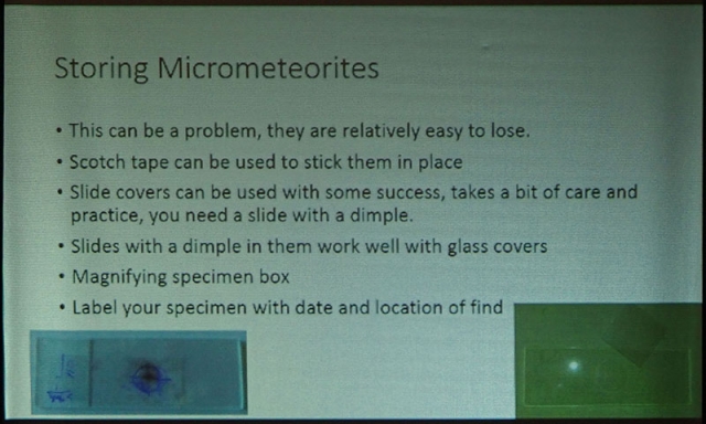 His talk covered several ingenious methods for collecting micrometeorites at home, how to identify them once collected and how to store them. As a complementary display, Leni Gagnon brought some of her meteorite specimen collection.